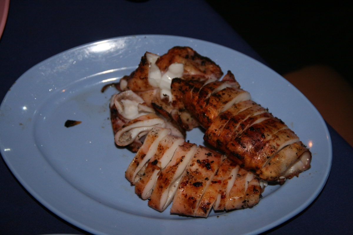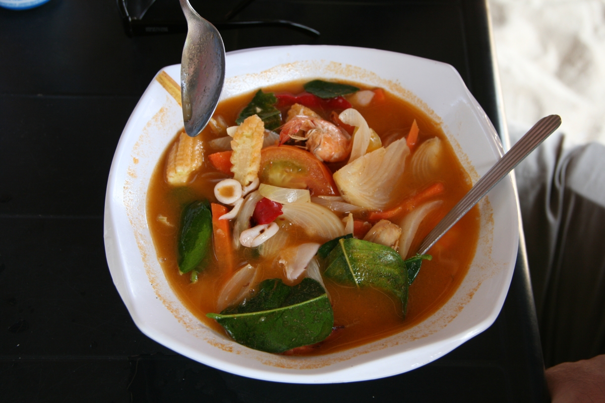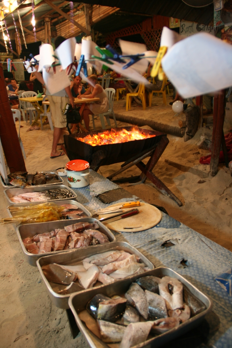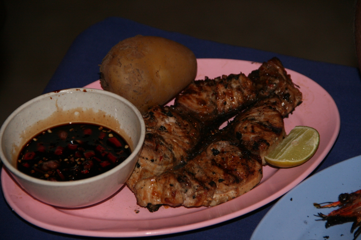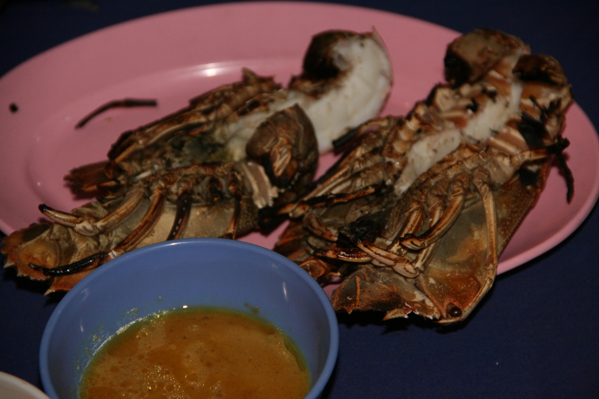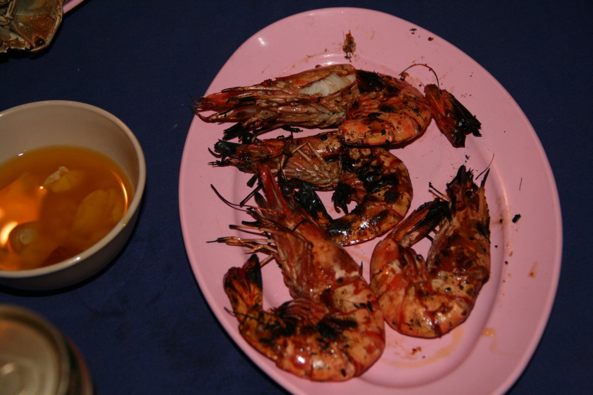 Wieczorami, zaraz po zachodzie słońca, Coral Bay zasnuwa się kłębami dymu. We wszystkich (czterech) knajpkach na plaży właściciele rozpalają swoje wielkie grille, by ku uciesze gromadzących się wygłodniałych białasów przygotowywać kolejne porcje świeżo złowionych ryb i seafoodu. W trakcie naszego pobytu, co wieczór napotykaliśmy ten sam problem: w jaki sposób złożyć zamówienie żeby spróbować wszystkiego co akurat w danym dniu można spróbować i by żadna pozycja z menu przypadkiem nie umknęła (menu stanowiła kartka wyrwana z zeszytu, na której odręcznie spisywano listę specjałów zakupionych z łodzi okolicznych rybaków). Do wyboru : barakuda, rekin, płaszczka, marlin, hiszpańska makrela, tilapia i jeszcze kilka gatunków ryb, których nazw nie pamiętam, wielkie krewetki, kraby, kalmary, langusty (nazywane przez miejscowych ‚lobsterami’) a wszystko to podawane z wieloma sosami do wyboru – kokosowym, chili, curry, sojowym z chili, słodko-kwaśnym, maślanym z czosnkiem… Cena porcji bez dodatków („no-set”) 10RM, z dodatkami 15RM (welcome drink, ryż, kawałki owoców, ciastko bananowe i pieczone ziemniaki).
