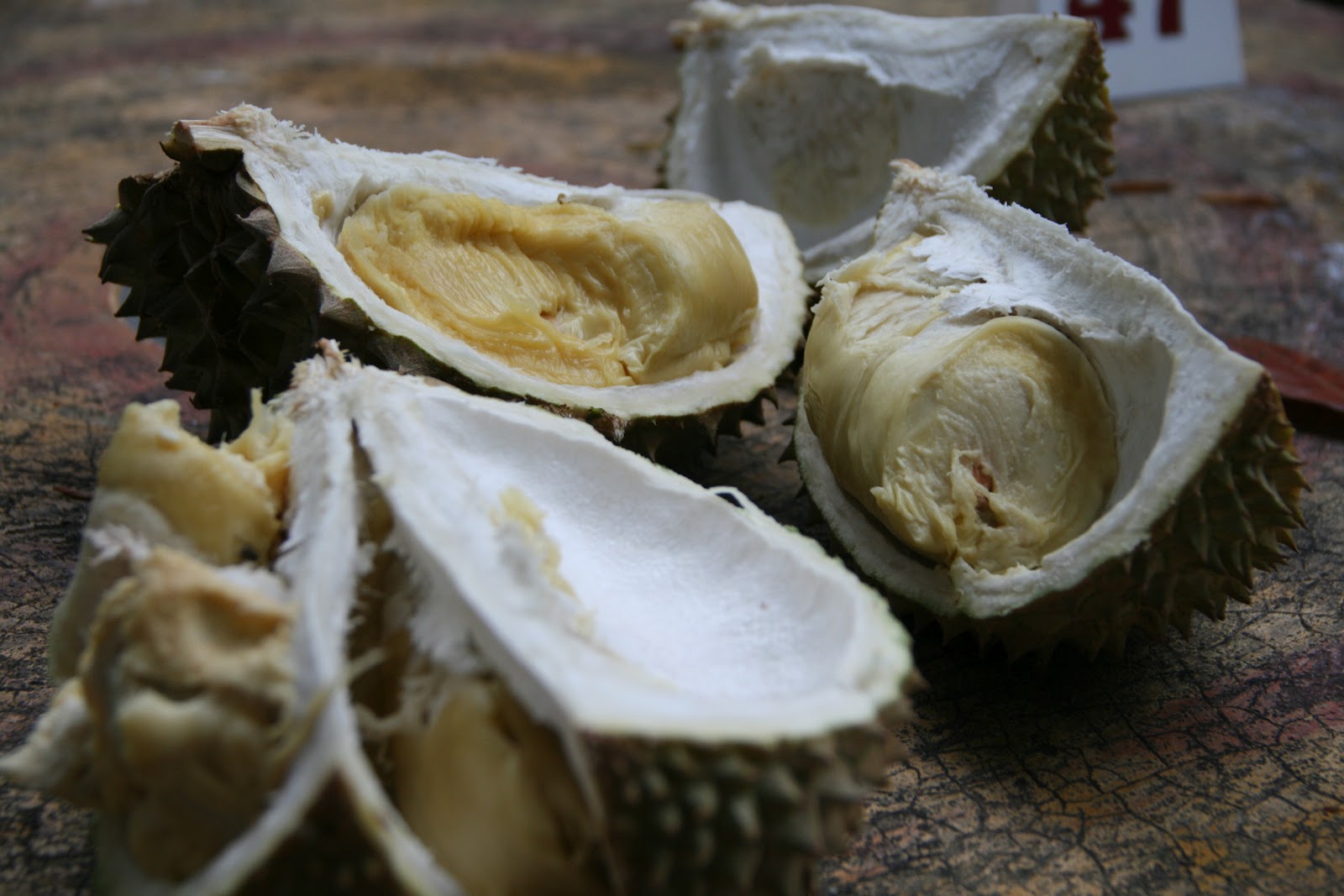 Nie wyobrażamy sobie wizyty w Azji bez zjedzenia duriana – owocu znanego ze swojego ‚specyficznego’ zapachu (który obrósł już w legendy). W przeciwieństwie do zeszłorocznych degustacji kilku owoców, tym razem trafił się nam owoc bardzo dojrzały, niesamowicie słodki, papkowaty, maślany. Pokonał nas. Nie daliśmy rady go zjeść, mimo że mieliśmy dobre chęci. Po zjedzeniu określonej ilości durianowej papki konsystencja okazała się nie do przełknięcia. Przy okazji: nie, durian nie śmierdzi jak stara szmata. Wcale nie jest tak, że nie da się wytrzymać w jego pobliżu dłużej niż 5 sekund. Rozkrojonego duriana czuć z daleka, ale nie jest to zapach obrzydliwy. Jest po prostu bardzo wyraźny i przebijający inne zapachy.