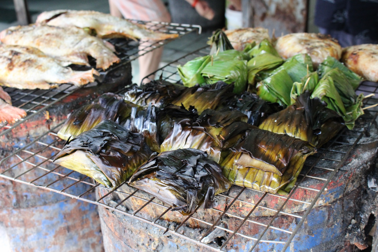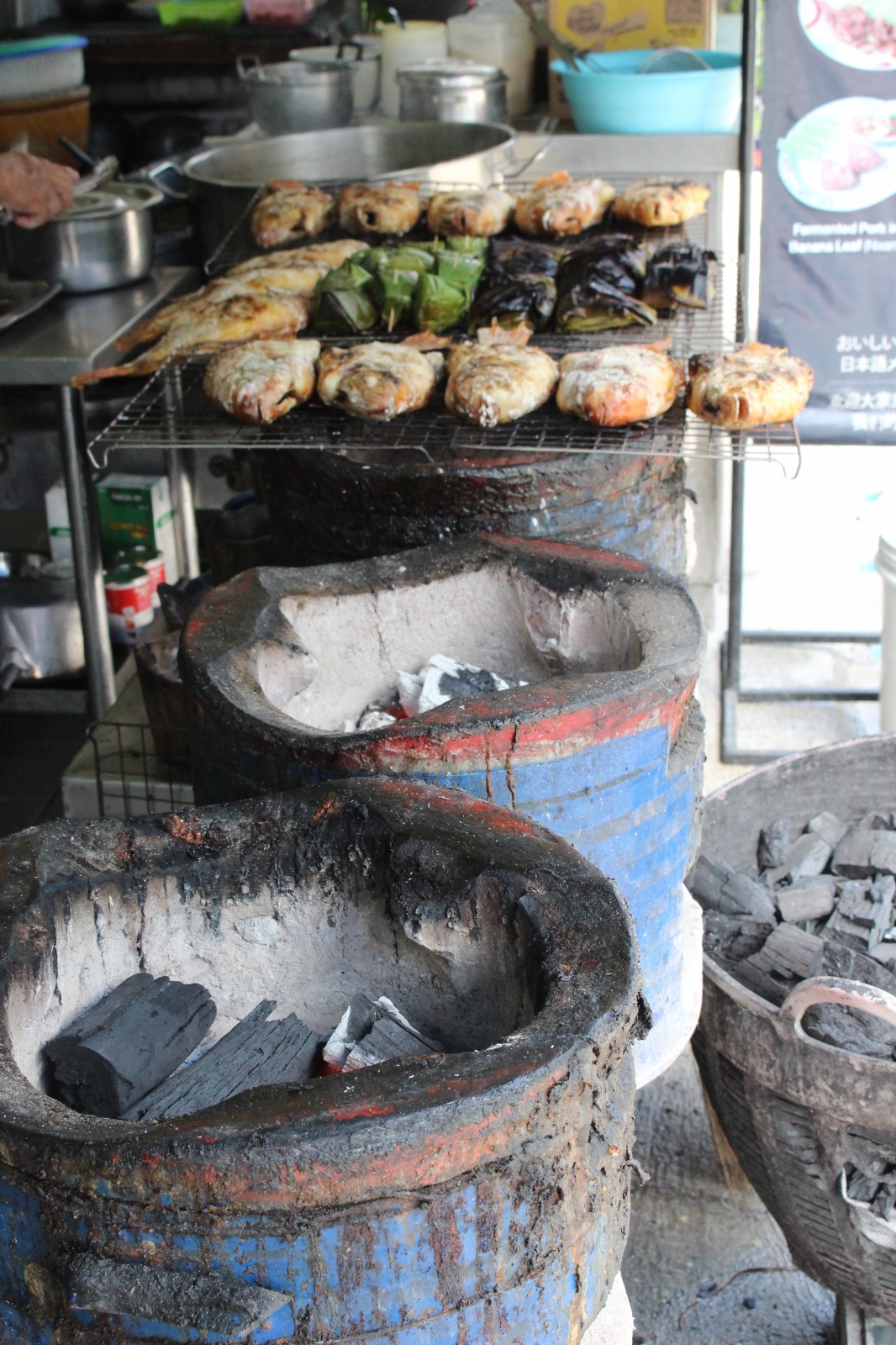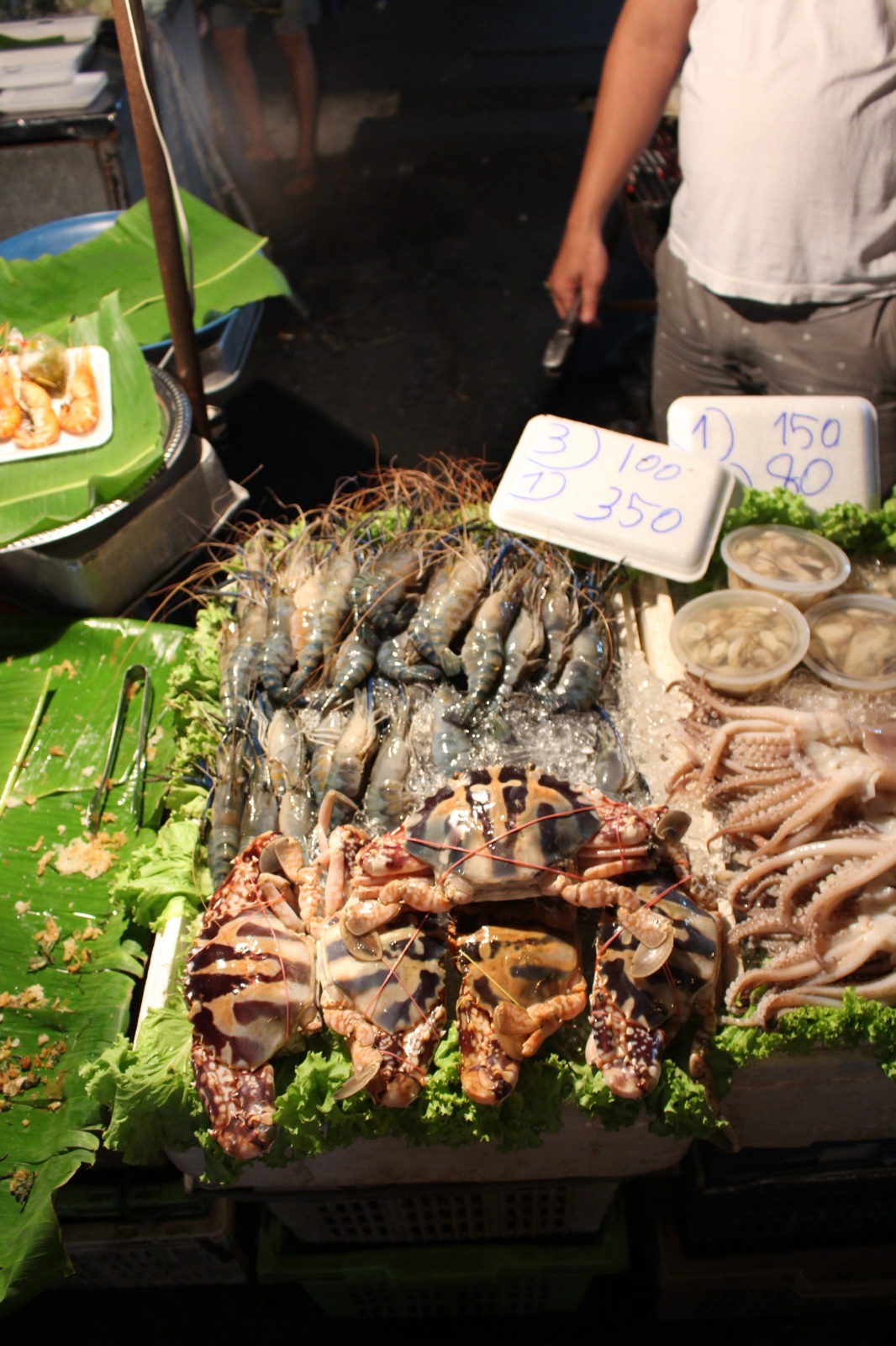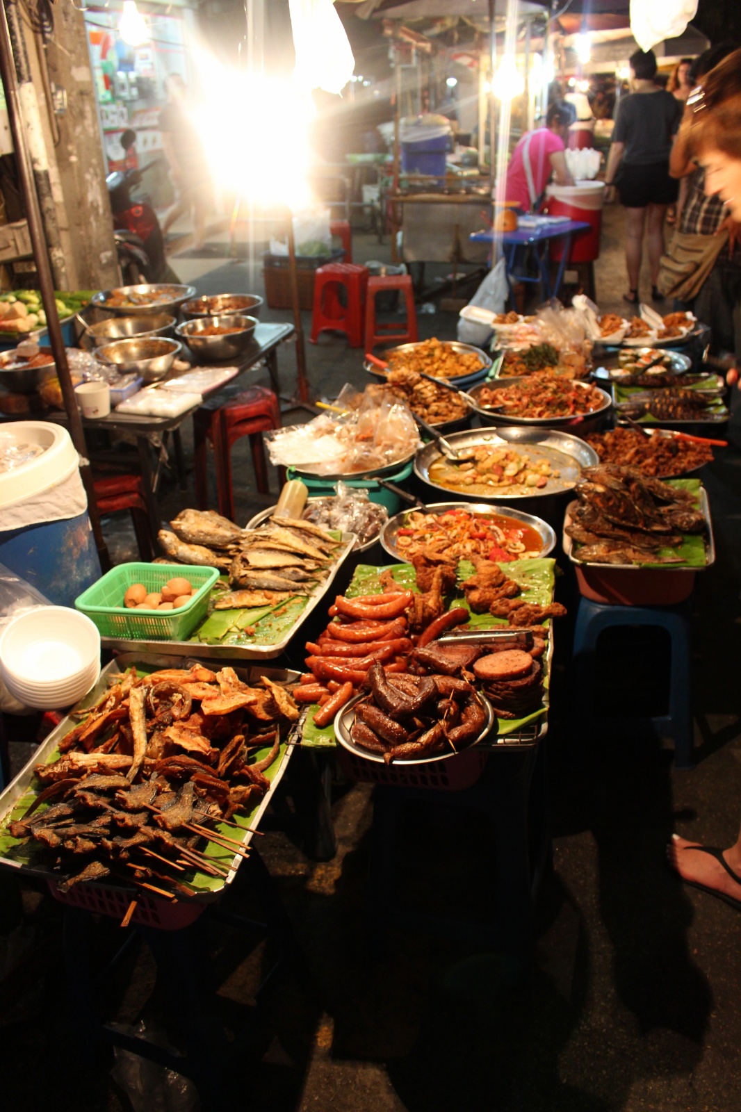 Już w trakcie poszukiwania noclegu trafiliśmy na miejscówkę obok której nikt o zdrowych zmysłach (a tym bardziej my) nie mógłby przejść obojętnie: knajpa z wystawionym grillem na którym skwierczą ryby i krewetki, węglowymi paleniskami dla woków w których robi się coś niesamowicie pachnącego i uwijającym się w kuchni chińsko-tajskim dziadkiem. Ocierając ślinę z brody obiecaliśmy sobie że koniecznie musimy tu zajrzeć co uczynisiśmy w trybie ASAP – dwie godziny później na stół wjechały półmiski (a raczej plastikowe talerzyki) z: rzeczoną rybą, krewetkami, zupą galangalową, sałatką z wołowiną (grilowana, pachnaca wolowina z odrobina warzyw w rewelacyjnym sosie), sałatką z papai, mielonym w liściach bananowca. Na dobitkę sticky rice z mango.. Jak się później okazało zamówilismy połowę pozycji z karty :)