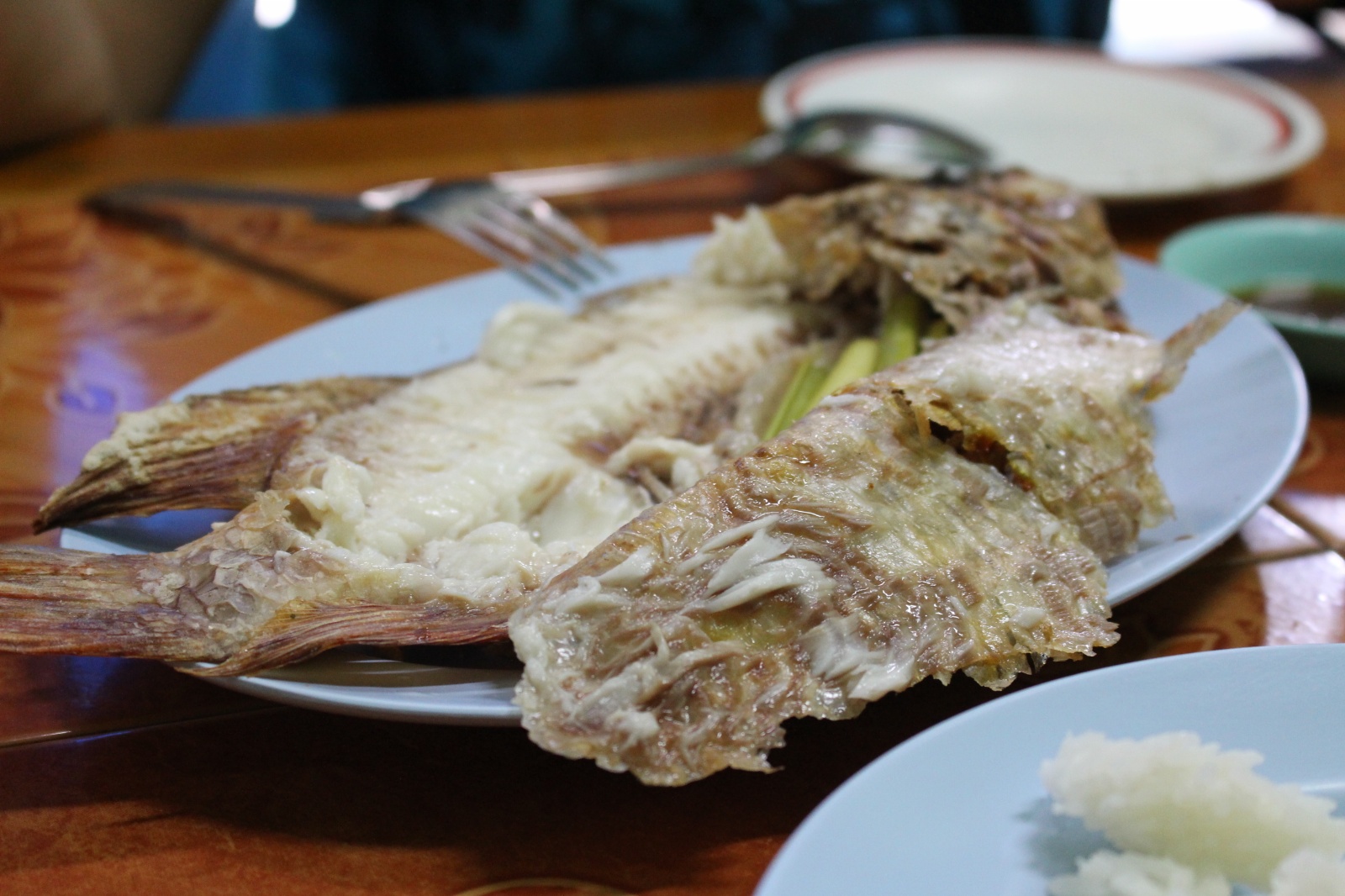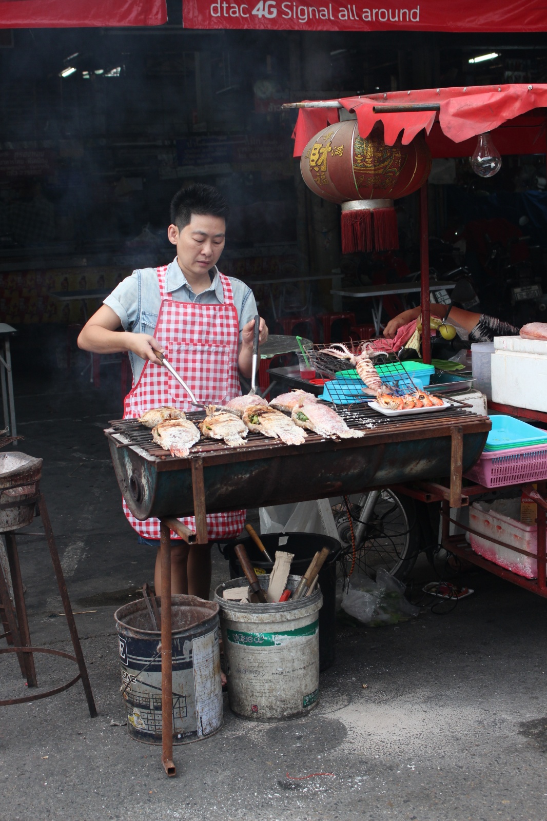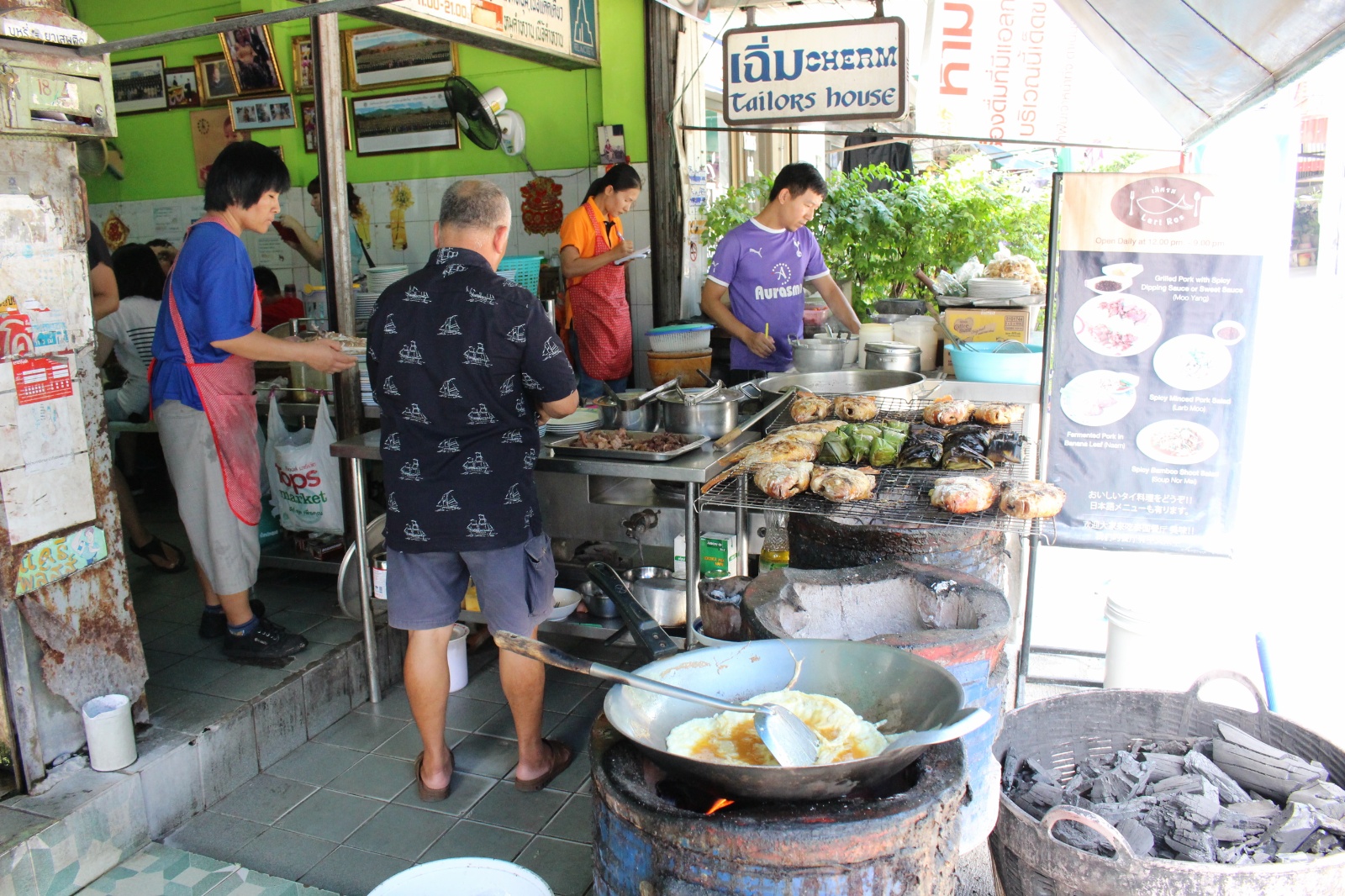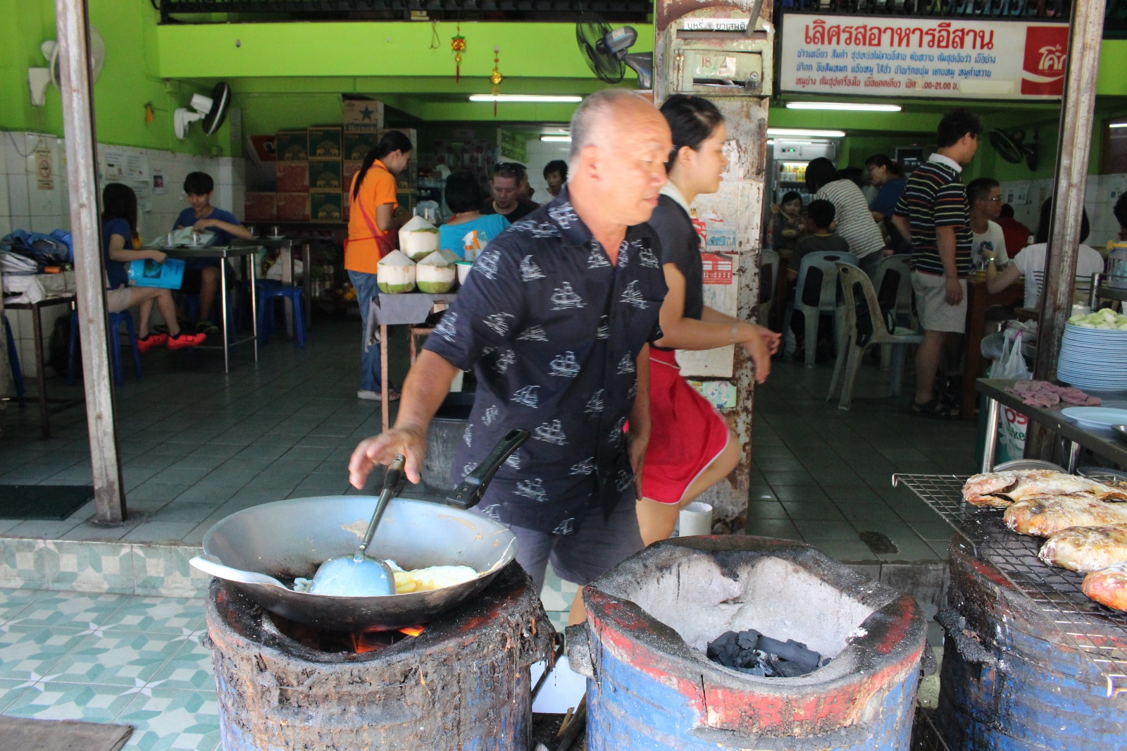 Już w trakcie poszukiwania noclegu trafiliśmy na miejscówkę obok której nikt o zdrowych zmysłach (a tym bardziej my) nie mógłby przejść obojętnie: knajpa z wystawionym grillem na którym skwierczą ryby i krewetki, węglowymi paleniskami dla woków w których robi się coś niesamowicie pachnącego i uwijającym się w kuchni chińsko-tajskim dziadkiem. Ocierając ślinę z brody obiecaliśmy sobie że koniecznie musimy tu zajrzeć co uczynisiśmy w trybie ASAP – dwie godziny później na stół wjechały półmiski (a raczej plastikowe talerzyki) z: rzeczoną rybą, krewetkami, zupą galangalową, sałatką z wołowiną (grilowana, pachnaca wolowina z odrobina warzyw w rewelacyjnym sosie), sałatką z papai, mielonym w liściach bananowca. Na dobitkę sticky rice z mango.. Jak się później okazało zamówilismy połowę pozycji z karty :)