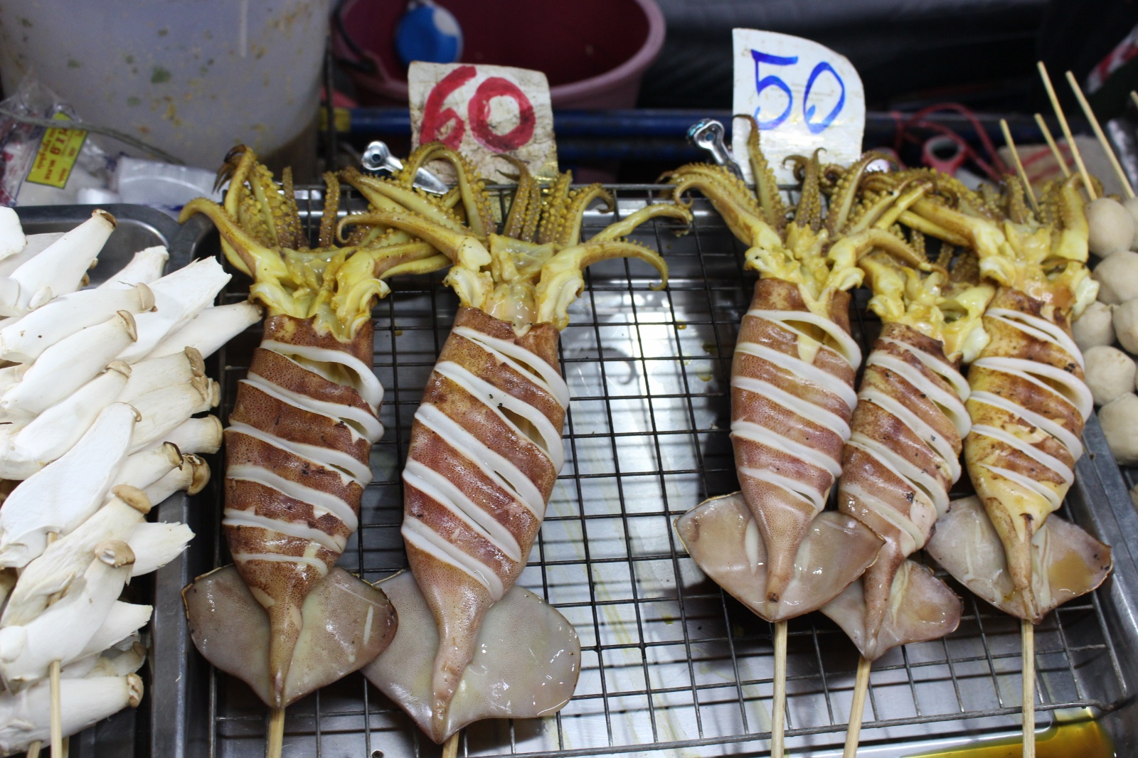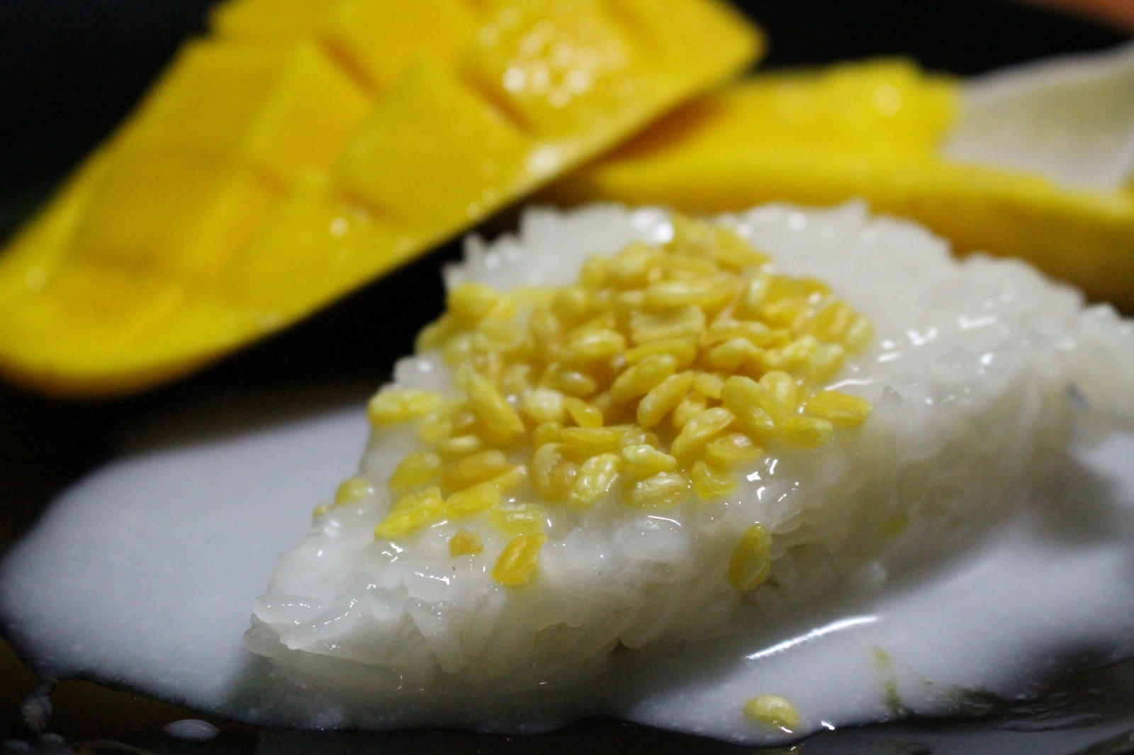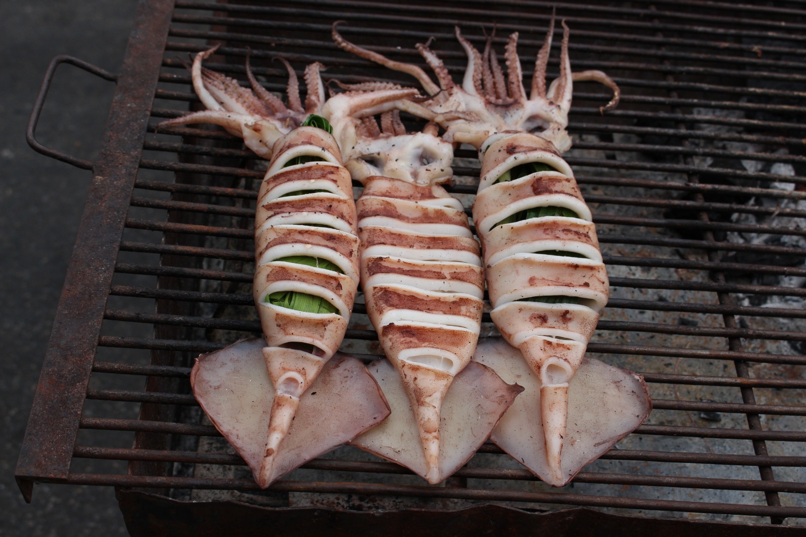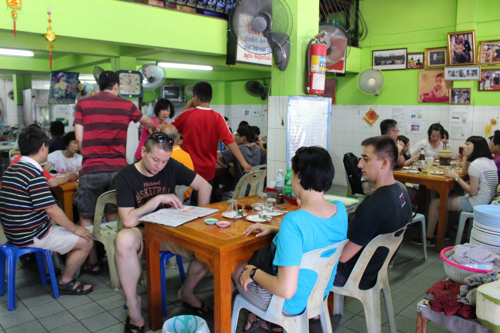 Już w trakcie poszukiwania noclegu trafiliśmy na miejscówkę obok której nikt o zdrowych zmysłach (a tym bardziej my) nie mógłby przejść obojętnie: knajpa z wystawionym grillem na którym skwierczą ryby i krewetki, węglowymi paleniskami dla woków w których robi się coś niesamowicie pachnącego i uwijającym się w kuchni chińsko-tajskim dziadkiem. Ocierając ślinę z brody obiecaliśmy sobie że koniecznie musimy tu zajrzeć co uczynisiśmy w trybie ASAP – dwie godziny później na stół wjechały półmiski (a raczej plastikowe talerzyki) z: rzeczoną rybą, krewetkami, zupą galangalową, sałatką z wołowiną (grilowana, pachnaca wolowina z odrobina warzyw w rewelacyjnym sosie), sałatką z papai, mielonym w liściach bananowca. Na dobitkę sticky rice z mango.. Jak się później okazało zamówilismy połowę pozycji z karty :)