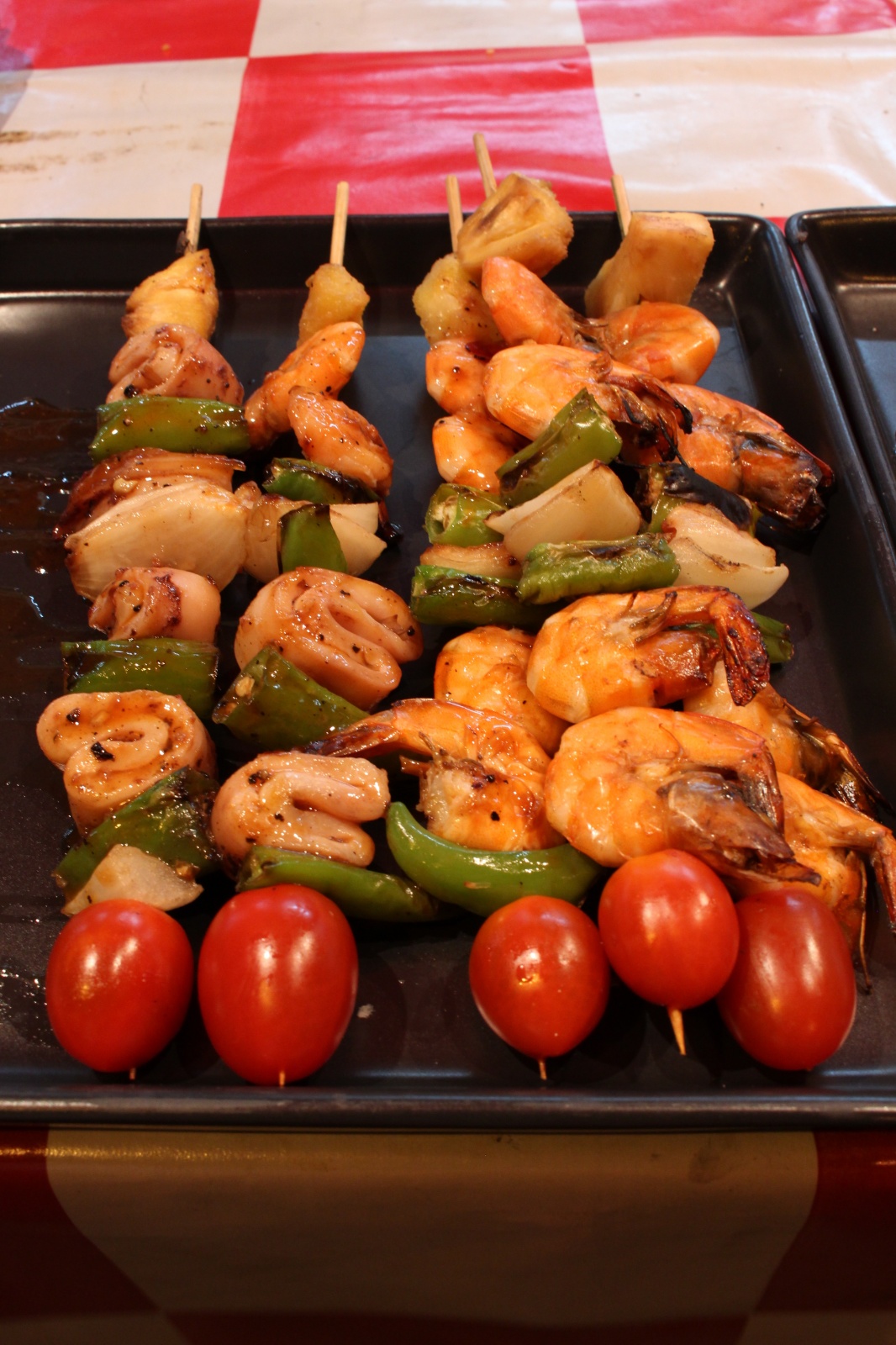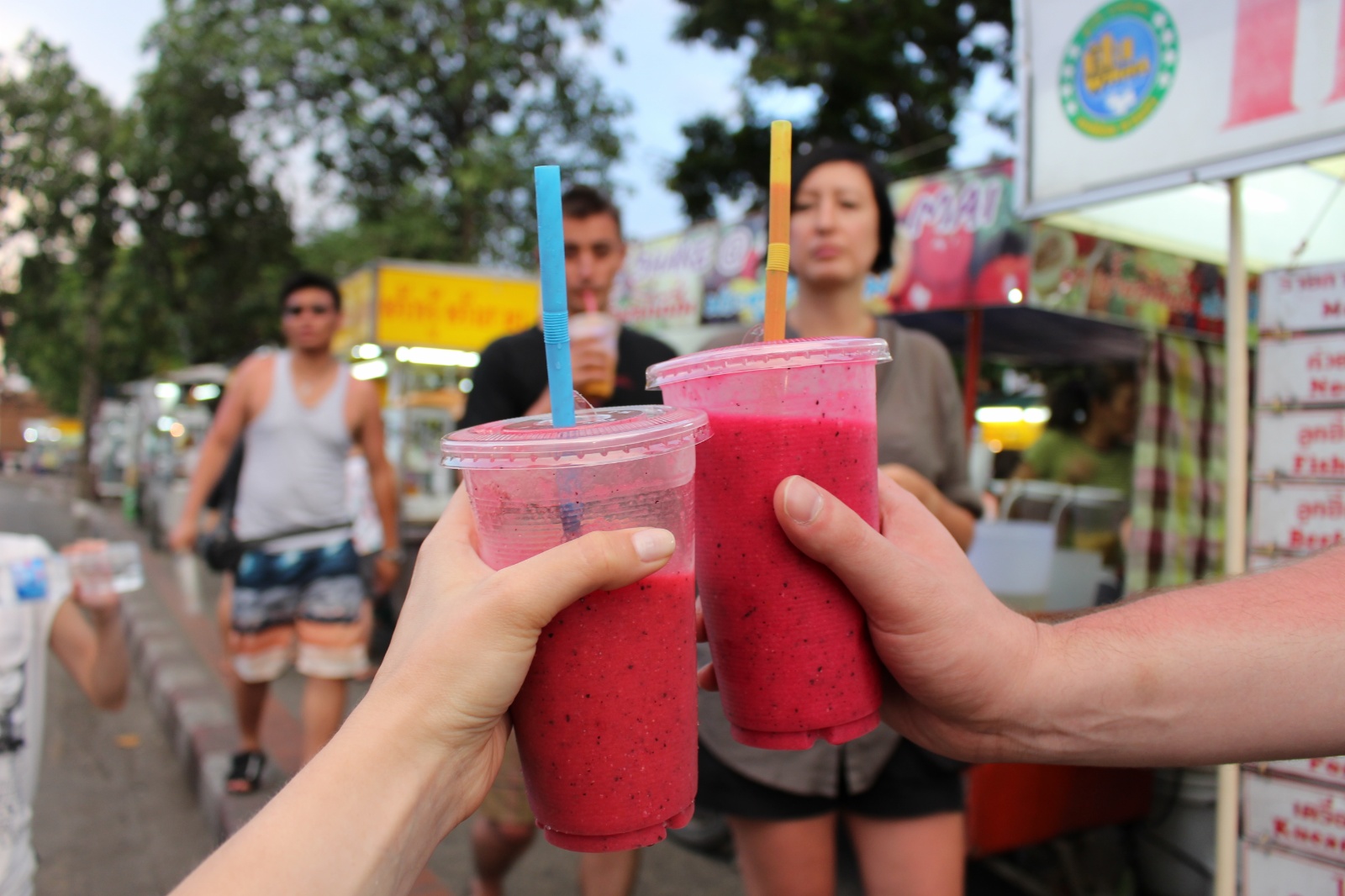(Na kulinarnej mapie zaznaczyć musimy jeszcze gastro targowisko przy południowej bramie w miasta. Przez pierwsze kilkanaście minut biegalismy w te i we wte, planujac zagospodarowanie przestrzeni żołądka produktami z wózków. Szaszłyki z kalmarów, rewelacyjne fruit shake ze stoiska Pa, wypalającą gębę sałatki z seafodem, roti..