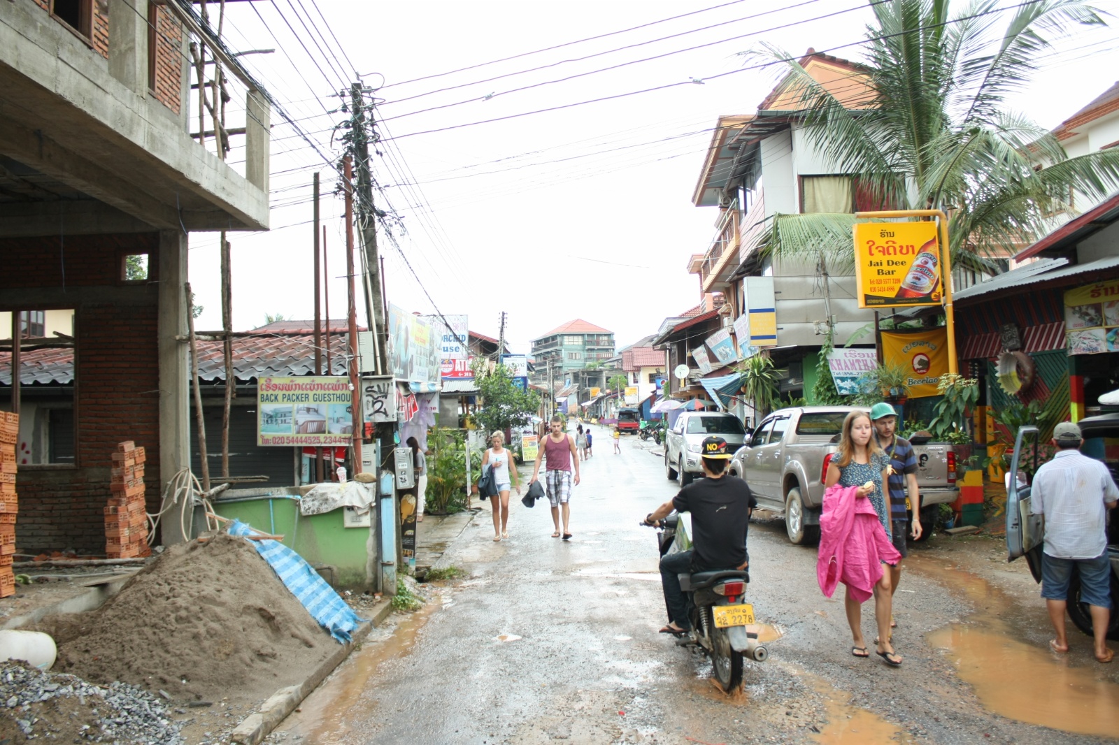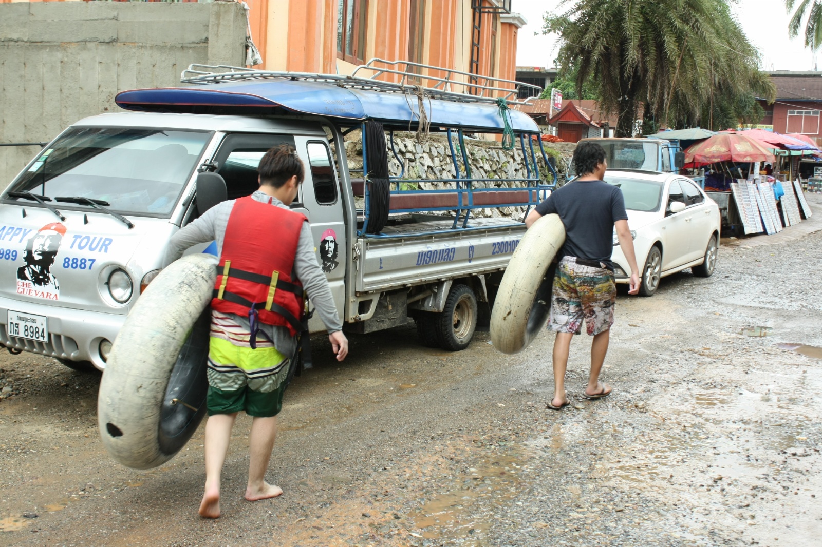 Vang Vieng to miejscowość, w której każdy znajdzie coś dla siebie. Niezłe jedzenie, imprezy, wspaniałe trasy widokowe w sam raz na przejażdżkę skuterem ale to spływ oponą rzeką Nam Song sprawił, że ta mała miejscowość na stałe wpisała się w obowiązkowy punkt podróży backpackersów po Laosie. Kilka lat temu ktoś wymyślił, że powolne 2h dryfowanie z prądem w oponie, a raczej dętce z opony do traktora może być fajne i interes chwycił. W przeciągu kilku lat opona przyciągnęła do VV masę backpackersów, mocno rozwijając miejscowość, a dzięki licznym barom dla oponiarzy wzdłuż rzeki sama atrakcja zyskała miano kultowej. Z biegiem czasu ekscesy na trasie spływu stały się jednak na tyle niebezpieczne że w 2012 władze Laosu postanowiły zrównać z ziemią wszystkie bary(2011-2012 ponad 30 przypadków śmiertelnych) Został tylko jeden symboliczny 30min od VV oraz sama opona, której sława jest na tyle nośna że wciąż nie brakuje chętnych do spróbowania niezależnie od dosłownie pory dnia i nocy czy warunków pogodowych. Nawet teraz poza sezonem amatorów opony nie brakowało. W VV byliśmy ledwo dwie noce, a grupy ubranych tylko w stroje kąpielowe albo jechało w górę rzeki na start spływu bądź szła przez miasto przepasana oponą aby ją już oddać. Widok co kilka godzin się powtarzał czy to noc czy dzień czy burza, a burza była cały czas;). Właściwie pierwszy raz podczas naszych podróży po Azji doświadczyliśmy tak intensywnych opadów w trakcie pory deszczowej. Poza 15min drugiego dnia właściwie cały czas nieprzerwanie lało jak z cebra, a prognoza wskazywała, że stan ten utrzyma się co najmniej jeszcze tydzień. Cóż widokowe trasy na skuterze w takiej aurze odpadły automatycznie, zjazd 2h oponą podczas burzy też nie brzmiał zbyt kusząco(…starość?)choć chętnych nie brakowało więc zostało nam już tylko jedzenie i bogaty nightlife co z naddatkiem wypełniło cały nasz pobyt w VV;). Trochę szkoda nam było tego, że pogoda uniemożliwiła nam w 100% na wykorzystanie wszystkich uroków tego miejsca ale nie narzekamy. Pomimo rzęsistych opadów polecamy wizytę w VV nawet w porze deszczowej. Opona już nie tak szalona ale dzięki temu odnowi się balans między zwiedzaniem pięknych krajobrazów a impreziwaniem. Warto zatrzymać się w VV przynajmniej na jeden dzień dla samego doświadczenia widoków(nawet w deszczu)i unikalnej atmosfery, pod której wpływem byliśmy od pierwszej nocy, aż po dzień wyjazdu do Vientiane.