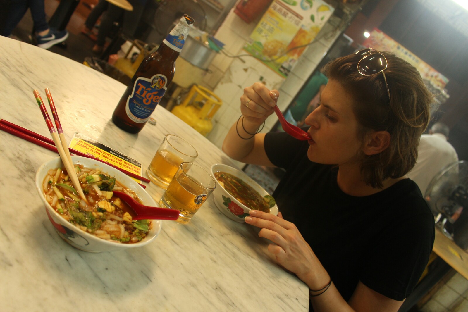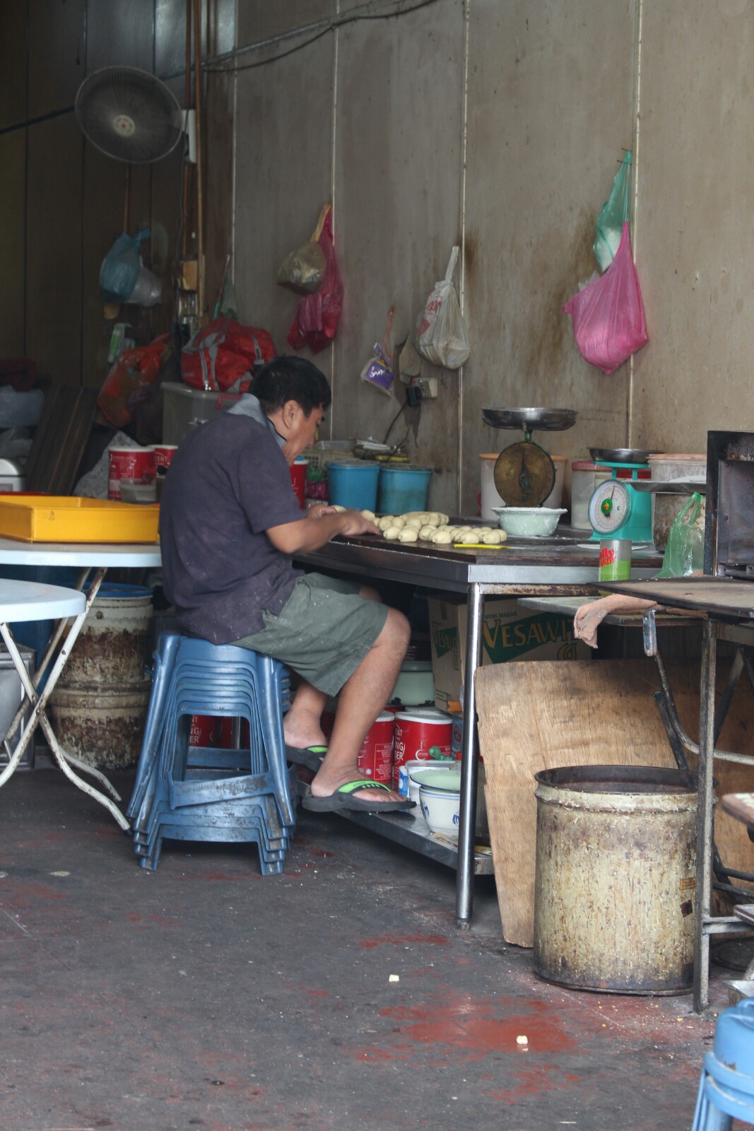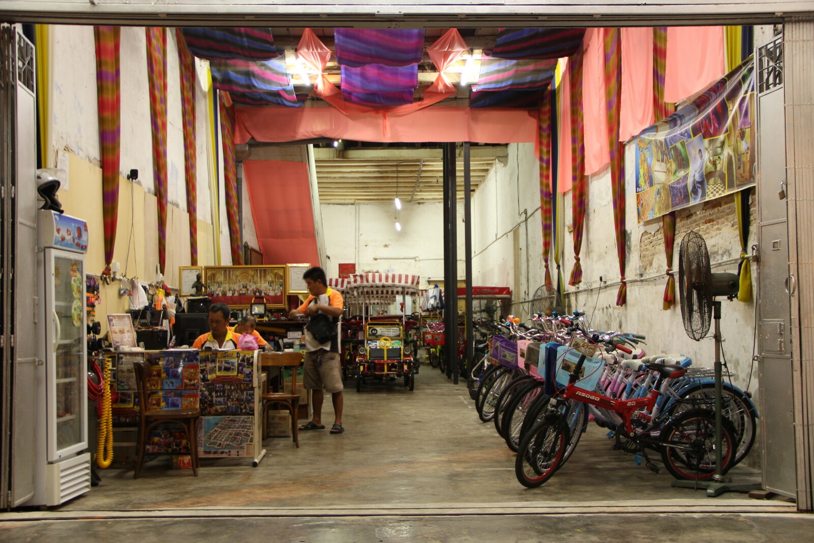 Co do samego miasta – tętni życiem i pełne jest szerokopojętej kultury, ze słynnym street artem na czele. Stara, kolonialna zabudowa w starej części miasta, zaadaptowana w typowo azjatycki sposób tworzy tu świetną, wyjątkową atmosferę prowokującą do bezcelowego przesmradzania się. My jednak mieliśmy cele jasno określone, oscylujące głownie wokół nabijania brzuchów, dlatego też zdecydowaliśmy się na wypożczenie rowerów – chyba najlepszego sposobu poruszania się po mieście. Udało nam się złapać jeden miejski z nieproporcjonalnie krótką kierownicą i drugi wielkości Jubilata, który z sentymentu Łukasz od razu zagarnął dla siebie. Tak więc pendalując szbciej sie przemieszczaliśmy, zwiekszyliśmy zasięg kilkukrotnie i przede wszytskim udało nam sie więcej spalić a tym samym wiecej dobrego trafilo do żołądka.
