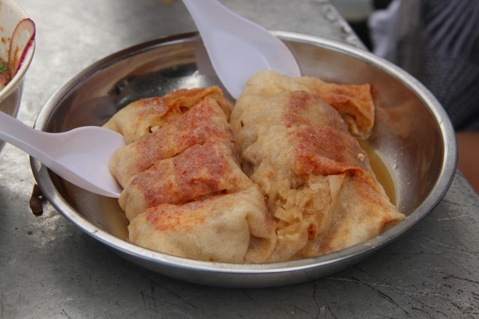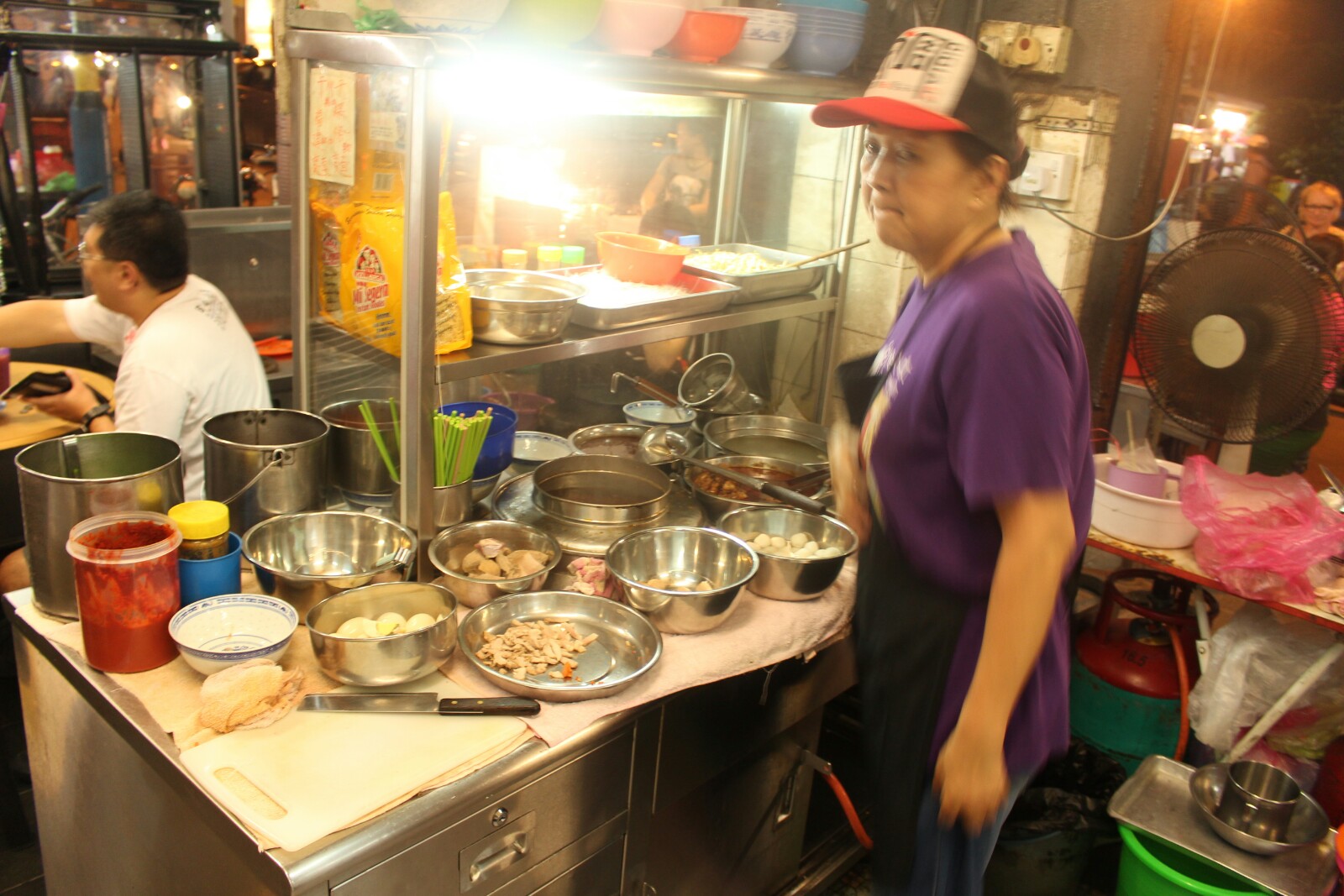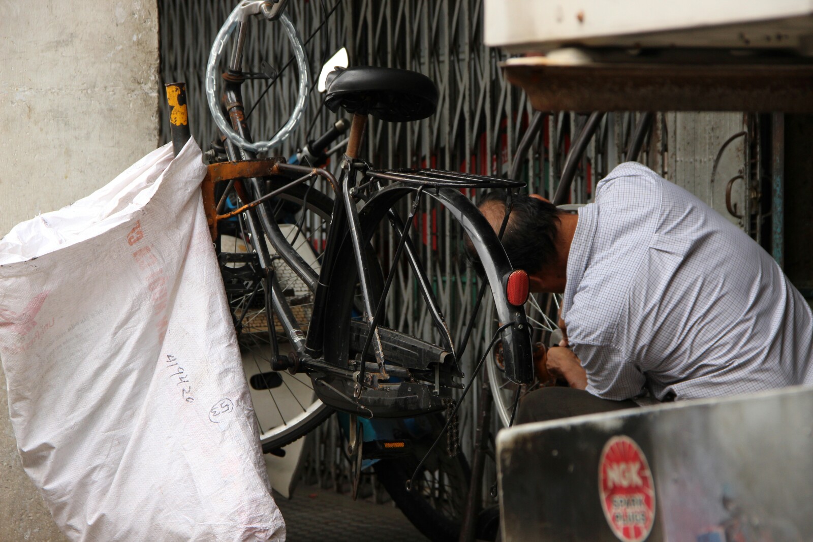 Co do samego miasta – tętni życiem i pełne jest szerokopojętej kultury, ze słynnym street artem na czele. Stara, kolonialna zabudowa w starej części miasta, zaadaptowana w typowo azjatycki sposób tworzy tu świetną, wyjątkową atmosferę prowokującą do bezcelowego przesmradzania się. My jednak mieliśmy cele jasno określone, oscylujące głownie wokół nabijania brzuchów, dlatego też zdecydowaliśmy się na wypożczenie rowerów – chyba najlepszego sposobu poruszania się po mieście. Udało nam się złapać jeden miejski z nieproporcjonalnie krótką kierownicą i drugi wielkości Jubilata, który z sentymentu Łukasz od razu zagarnął dla siebie. Tak więc pendalując szbciej sie przemieszczaliśmy, zwiekszyliśmy zasięg kilkukrotnie i przede wszytskim udało nam sie więcej spalić a tym samym wiecej dobrego trafilo do żołądka.