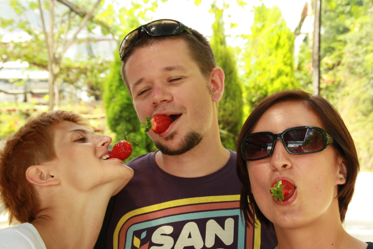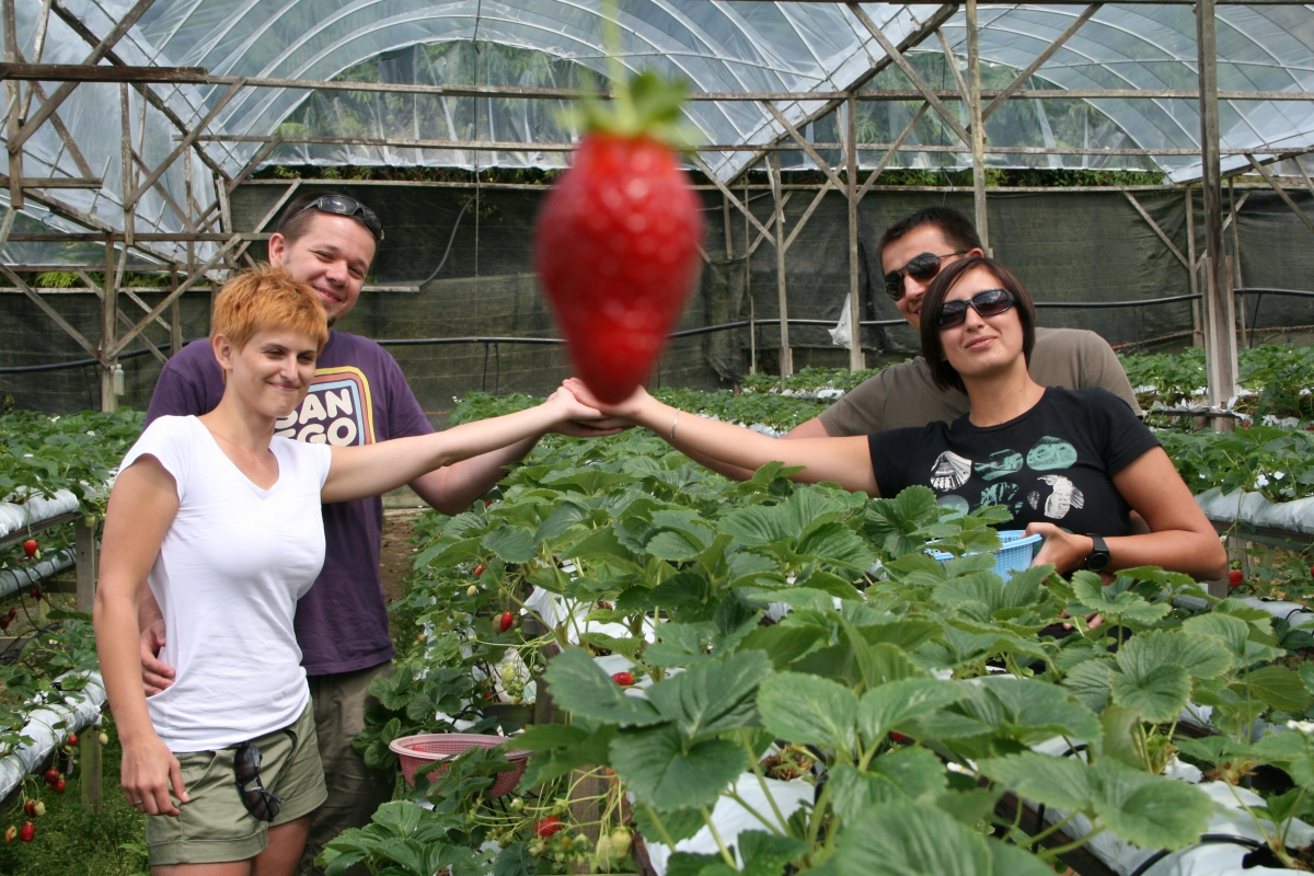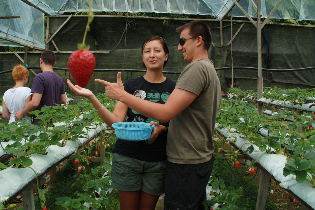 Nagle z tyłów szklarni wyłaniają się dwie postaci: „Good morning sir, how are you, beautiful strawberries, come we will show you”. I od tego momentu zaczyna się szoł – muzułmanie odbierają nam aparaty a my zbici z tropu posłusznie zaczynamy pozować zgodnie z ich Malajglishowymi wskazówkami. Trochę jak w fabryce czekoladek Willego Wonky – my w roli dzieciaków a Wonków jest dwóch. „Take your wife here, turn right wife left, wait beautiful (click). Another photo, do this (click). Know honeymoon kiss, Boss? Take the strawberry in your mouth Boss” i tak kilkanaście minut. My jak te marionetki truchtający/przybierąjący posłusznie kolejne pajacykowe pozy pośrod truskawkowych grzęd i ci dwaj „Wonkowie” kicający wokól nas, usiłujący ustrzelić zdjęcie roku. La Chapelle wycisnąłby z tej scenerii niezłe foty. W nagrodę za cierpliwość pochłonęliśmy własnoręcznie nazbierane 1kg truskawek za 40RM!!! Dobre ale trochę inne i gorsze od tych naszych.