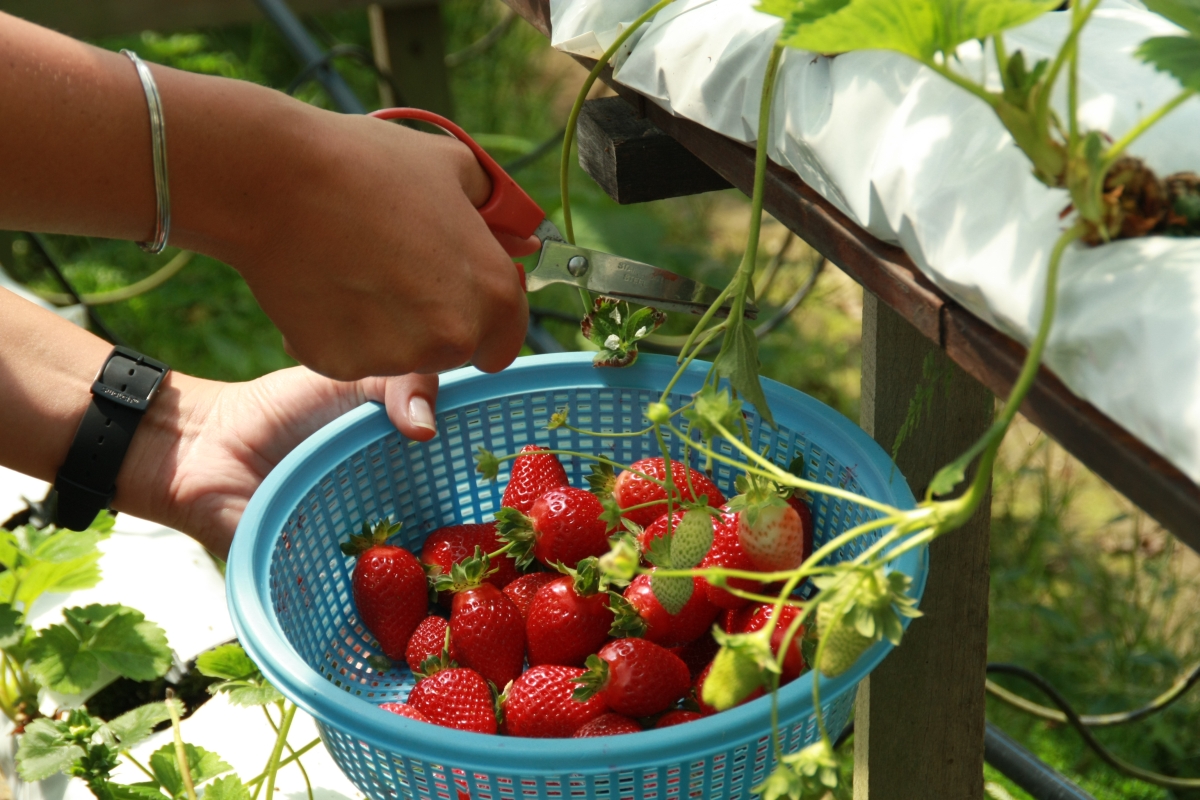 Wchodzimy do szklarni: w środku rzędy stojaków z krzakami uginającymi się od czerwoności truskawek.