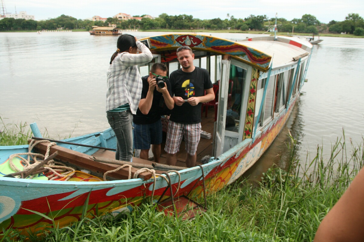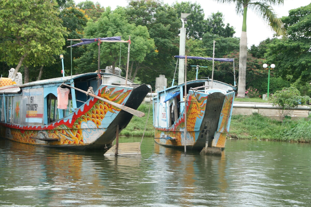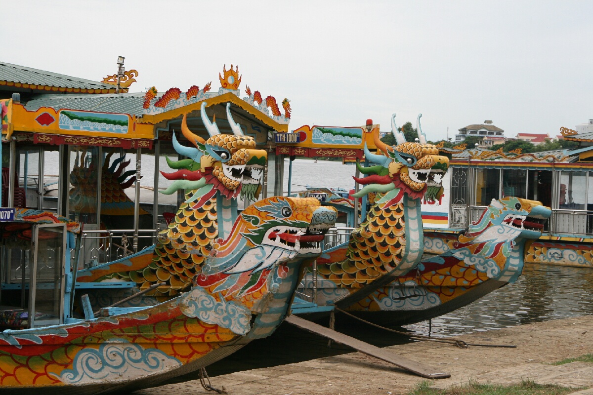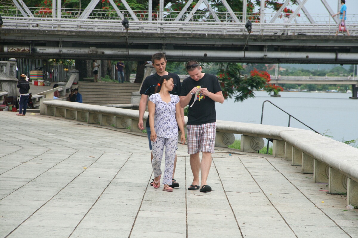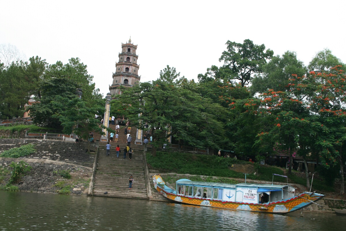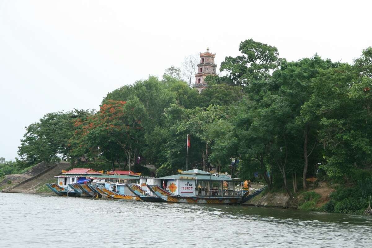 Pora zapracować na kolejne piwa – planujemy wyruszyć na rejs po Rzece Perfumowej, zaliczając polecane przez wszystkich świątynie i grobowce położone wzdłuż niej. Ponownie dajemy się upolować jednej z portowych nagabywaczek i po chwili targowania i ustalenia trasy wsiadamy na zdezelowanaą łódkę z terkoczącym dieslem i kabiną oczywiście zupełnie nieprzystosowaną rozmiarowo do białych ciał. Jako plan wycieczki ustalamy wizytę z słynnej Pagodzie a następnie po dłuższym rejsie (jak wynika z mapy) odwiedziny w jednym z grobowców (Tuc Duc Tomb) i jednej świątyni. Ze względu na dosyć późną porę decydujemy się tylko na te trzy punkty, odpuszczając najciekawsze, jednak też najbardziej odległe. Wycieczkę do trzech wybranych punktów nawoływaczka szacuje na 3h.