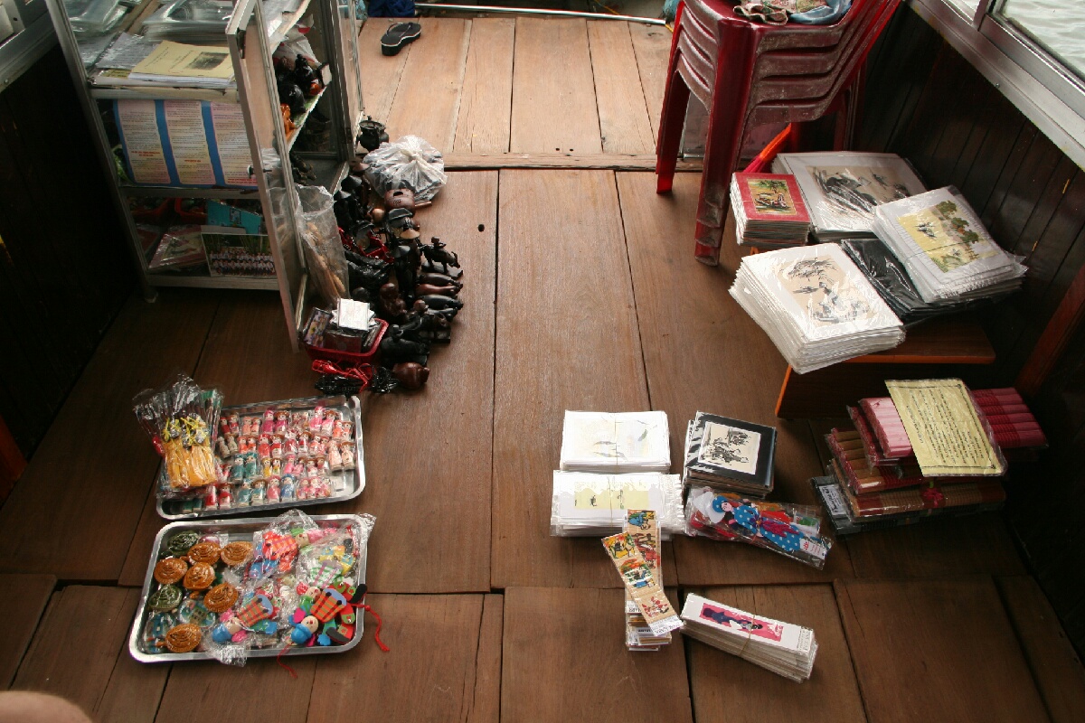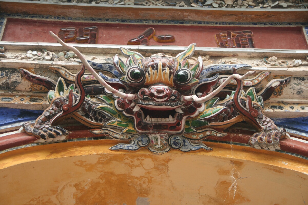 Powrót na łodkę, płyniemy… w drogę powrotną ? Coś nam nie pasuje. 3 min. dobijamy do jeszcze większych krzaków. Pani prosi nas abyśmy ruszyli do światyni za nią. Przebiegamy przez ulicę, gdzieś na przedmieściach Hue, „przewodniczka” biega po przydrożnych domach wyraźnie za czymś się rozglądając. Wchodzimy w boczna uliczkę, dopytuje o coś lokalnych, wracamy, przechodzimy kawałek dalej, pod bramę jakiegos prywatnego domu. Cały czas rozbawienie pomieszane ze zdenerwowaniem, teraz juz na 100% wiemy że mała chytra baba z Hue chce nas zrobić w konia, w jakis absolutnie banalny sposób. Składając ręce do modlitwy wskazuje nam maleńką kapliczkę u kogoś na podwórku. Chyba chce nam przekazać, że własnie dotarlismy do trzeciego punktu wycieczki. W powietrzu wisi awantura. Rezygnujemy z biegania po cudzym podwórku, wracamy na łodź gdzie prosimy o mapę i zaczyna się sprzeczka. Po chwili, wietnamka tak jakby ulega. Ruszamy. Płyniemy 2min na drugą stronę rzeki, dopływamy do krzaków przy których słyszymy