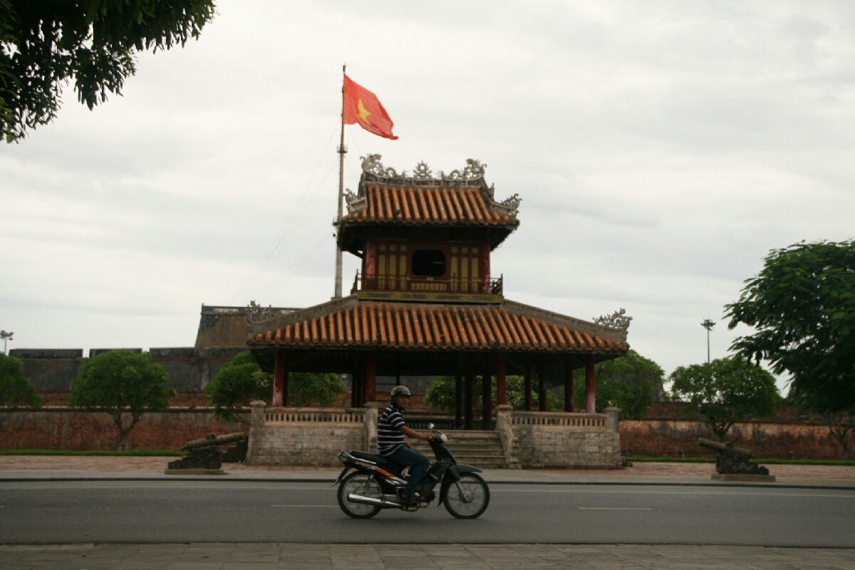Po należnym nam, sporym odpoczynku w hotelu (Than Thien – Friendly Hotel, z bardzo friendly obsługą) wyruszamy w miasto. Rozpoczynamy od wielkiej cytadeli cesarza, otoczonej murami o łącznej długości ponad 10 km. Zaplanowany spacer w jej stronę przerywa nam naganiaczka do łodzi. Za 1usd (tradycyjnie prawdopodobnie mocno przepłacone) od głowy obiecuje nas zawieść pod mury cytadeli. W trakcie kilkuminutowego rejsu w kabince małej łodki Pani Nawigator rozkłada specjalnie dla nas kramik z pokaźną ilością przeróżnych pamiątek. Niezwykle atrakcyjną ofertę jednak odrzucamy. Kramik znika w ciągu 30 sekund a my dobijamy do… do krzaków? Krótka przeprawa przez chaszcze do kolan, po czym wyłaniają się przed nami imponujące mury cytadeli. Nad nimi powiewa wielka flaga Wietnamu wielkości chyba połowy miasta w którym jesteśmy.