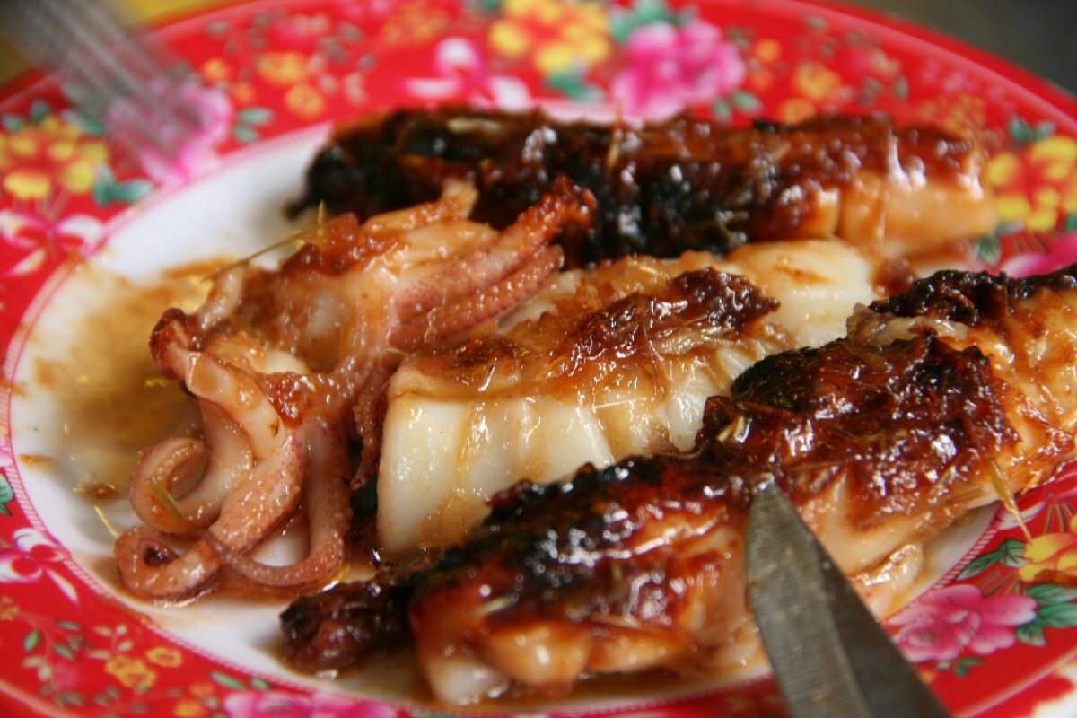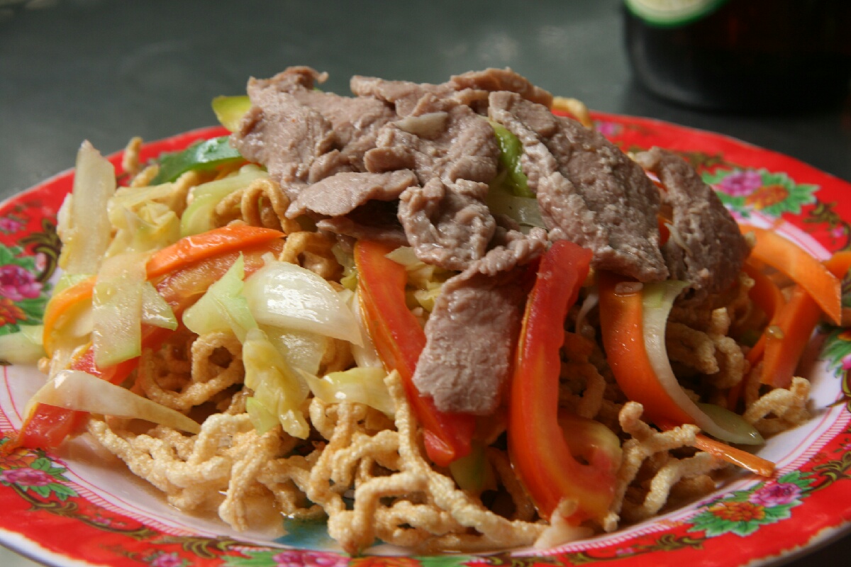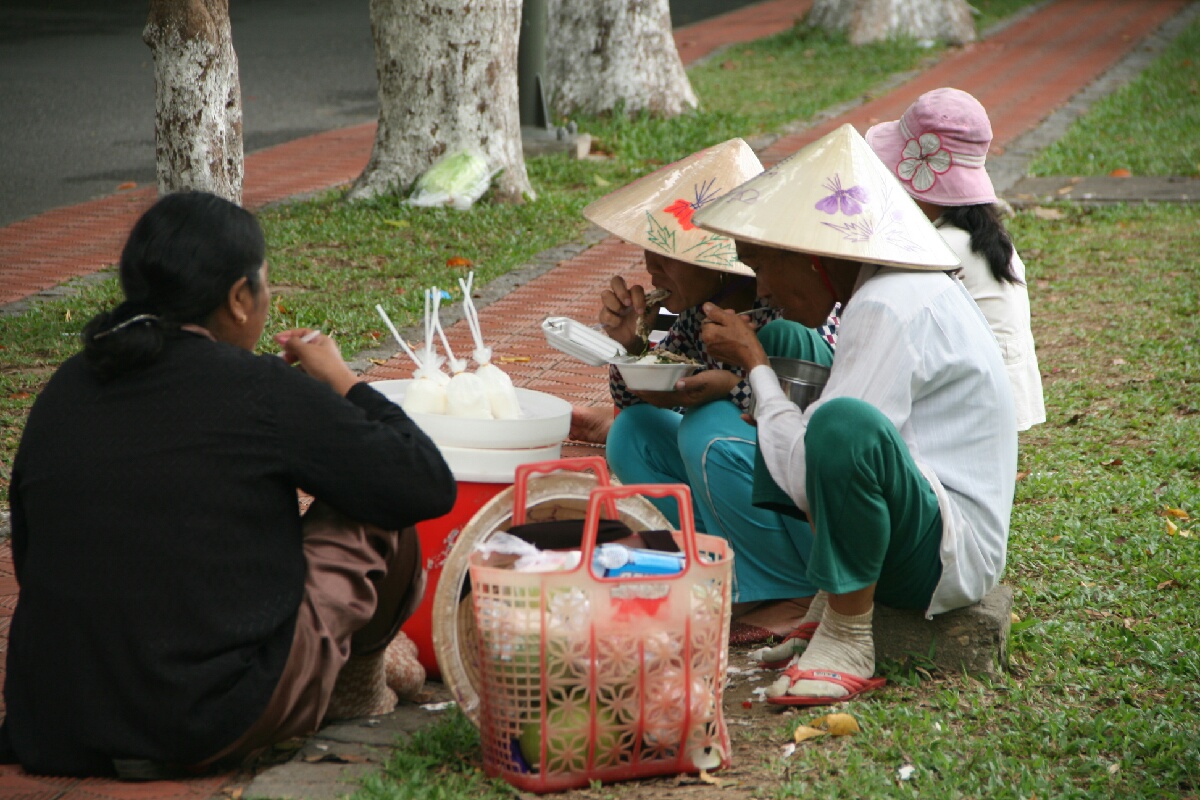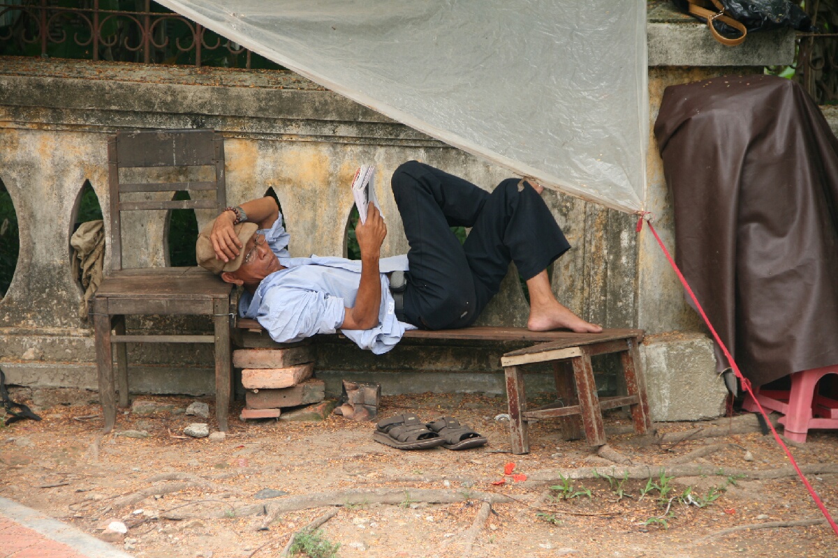 Trzymając się żelaznej zasady „maksimum dwa zabytki – jedno piwo” kierujemy się w stronę jadłodajni łamiąc inną zasadę „nie chodzimy do knajp polecanych przez przewodniki”. Nieprzestrzeganie powyższych zasad często prowadzi do niemiłych konsekwencji, jednak zasady są po to żeby je łamać (przynajmniej drugą z nich). Knajpa oczywiście przepełniona białasami z przewodnikami w rękach, z wystrojem będącym niewątpliwie dziełem kolejnych białych z flamastrami. Europejski rozmiar krzesełek nie dodaje uroku. Siadamy na tarasie na pierwszym piętrze. Na jedzenie czekamy wyjątkowo długo a i tak nie dostajemy częsci zamówionych dań. Samo jedzenie średniej jakości – zachwalany ‚crispy noodles with pork’ wypada znacznie poniżej oczekiwań a Pho (wietnamska zupa z makaronem) czy kalmary na parze nie zaskakują absolutnie niczym.