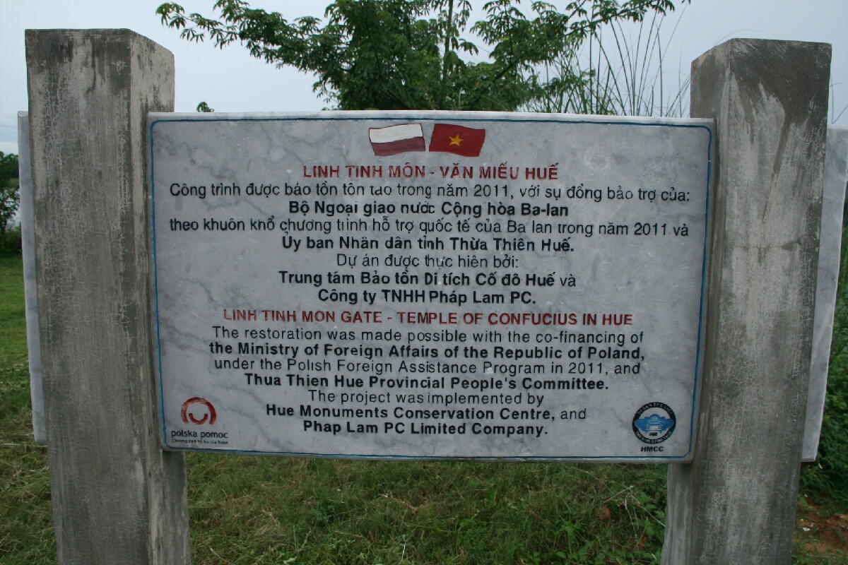 Boarding. Pierwsze zdziwienie – łódka nie ma kramiku z pamiątkami? Po 5 minutach drugie zdziwienie – kramik wyrasta zupełnie znikąd. Zestaw suwenirów identyczny jak poprzednio. Zdziwienie nr 3 – nawigatorka szybko nas rozgryza składając ofertę na ciepłe piwo, która pokornie przyjmujemy. Rejs do pierwszego punktu – Pagody przebiega w miłej atmosferze. Dobijamy do zorganizowanego wybrzeża, wysiadka i przechadzka. Pagoda wraz z przyległym kompleksem ciekawa, pomimo sporej ilość zwiedzających całkiem kameralna, na pewno warta odwiedzin. Ruszamy dalej. Po krótkim 10 min rejsie, dobijamy do krzaków. Pani przewodnik, stary wilk rzeczny, kieruje nas przez ulicę do małego cichego obiektu, za którym znajduje się cmentarz. Obiekt ten to świątynia składająca się z placyku, paru tablic ustawionych na kamiennych żółwiach i ładnej bramy. Przyjemne dla oka, ale spodziewaliśmy się czegoś znacznie ciekawszego i bardziej imponującego – „pewnie nie robi na nas wrażenia, bo tego nie rozumiemy i nie znamy tutejszej kultury”. Przy wyjściu trafiamy na tablicę – Świątynia Konfucjusza, odrestaurowana dzięki współpracy Polskiego MSZ z Wietnamskim. Miło. Ale nazwa chyba się nie pokrywa z tym do czego mieliśmy płynąć. No ale cóż – wietnamska język trudna język.