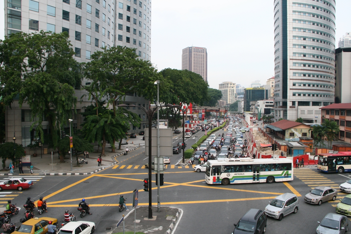 Nieliczni biali łatwo są rozpoznawalni po mokrych śladów na chodnikach od utraty hektolitrów wody ;). Miasto niby nowoczesne, szybkie kolejki, 4-5 pasmówki ale miejscami jednak mocno zaniedbane. W całym mieście panuje nieustanny pęd do przemieszczania się. To zadziwiające jak mając szybką kolejkę powietrzną z rozbudowaną siecią połączeń, można mieć tak zakorkowane ulice. Jest walka o każdy milimetr kwadratowy jezdni i to właściwie z małym ruchem taksówkarskim (zdecydowana większość pojazdów to samochody prywatne). KL z pewnością nie jest miastem dla pieszych, o czym bardzo szybko się przekonaliśmy. Każda próba poruszania się piechotą to duże wyzwanie. Brakuje przejść dla pieszych, kładek itp. Przez jezdnię przechodzi się w tzw. w Kuala Style (nieważne ile jezdnia ma pasów i jakie jest światło, ważne jak jesteś szybki i zwinny.. i czy uda ci się zdążyć). Ogólnie odnieśliśmy wrażenie, że KL nie jest kompletnie nastawione na ruch turystyczny – śladowa ilość informacji, najprostszych oznaczeń kierunków itd. Jeśli nie ma czegoś na trasie kolejki to od tubylców ciężko uzyskać pomoc – niestety nie znamy Malayglisha…