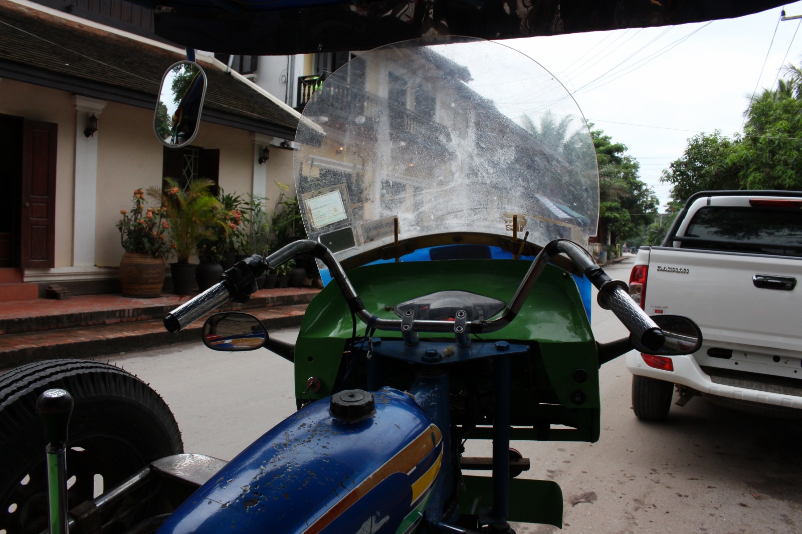 Planowaliśmy się tu odkuć finansowo po wielkim żarciu w Tajlandii. Okazało się jednak że wypływ gotówki stał się jeszcze bardziej dynamiczny. LP jest drogie. Lokale i punkty nastawione na białych turystow mocno winduja ceny. To tutaj wypożyczylismy najdroższy do tej pory skuter w trakcie wszystkich pobytów w Azji – ponad 70zl za dzień [sic!] za mocno już zmęczoną hondę. Nietrudno jest tu trafić na zwykłe obiadowe posiłki w cenach zbliżonych do polskich czy europejskich. Niby globalizacja, ale Laos to nadal wciąż jeden z najbiedniejszych krajów Azji… w co z drugiej strony ciężko uwierzyć patrząc na samochody na ulicach – hiluxy, kia, hyundai – wszystko raczej nowe, zadbane na pięknych alufelgach, przeważnie totalnie zabłoconych – niewiele jest tu poza miastem asfaltowych dróg. Taki to dziwny kraj.