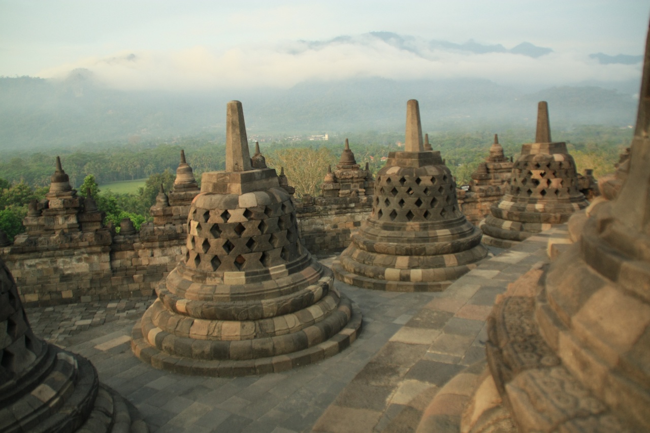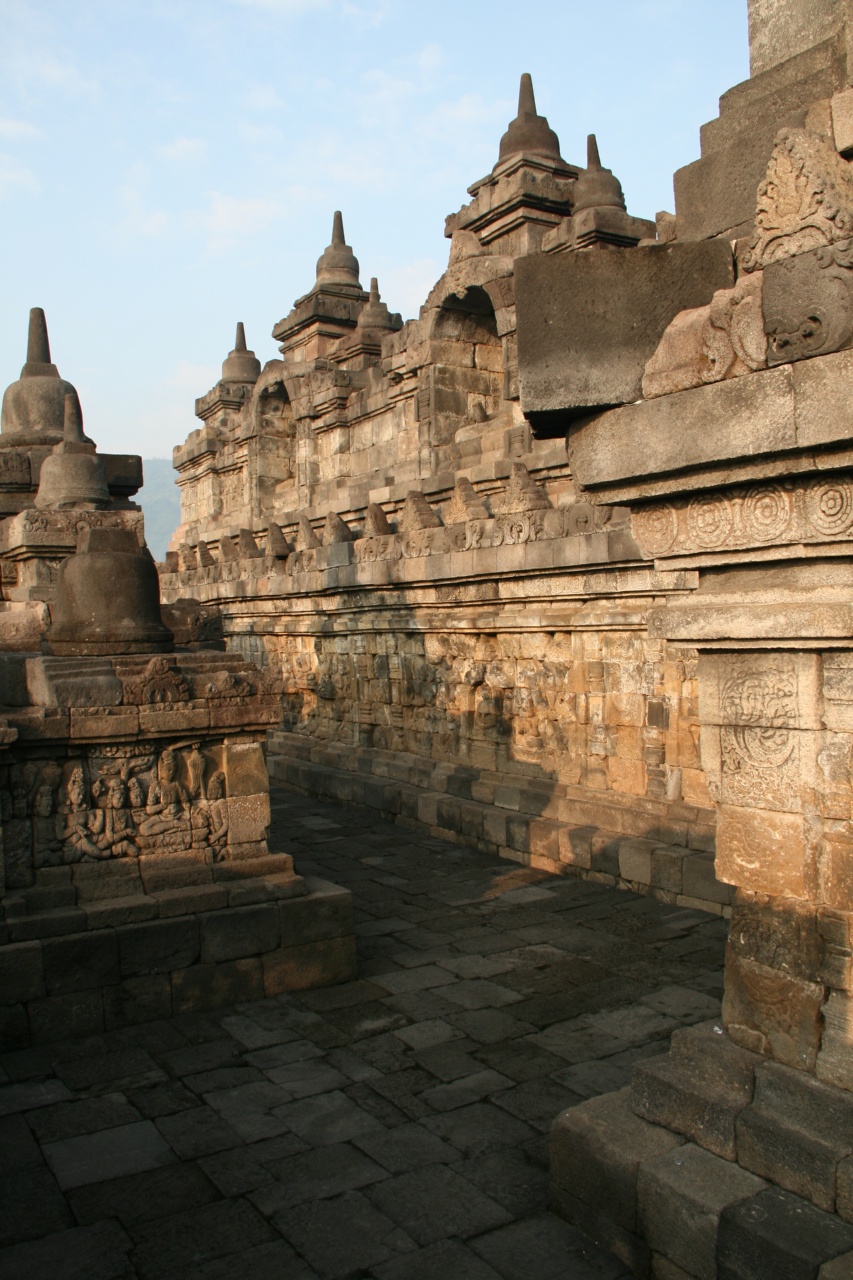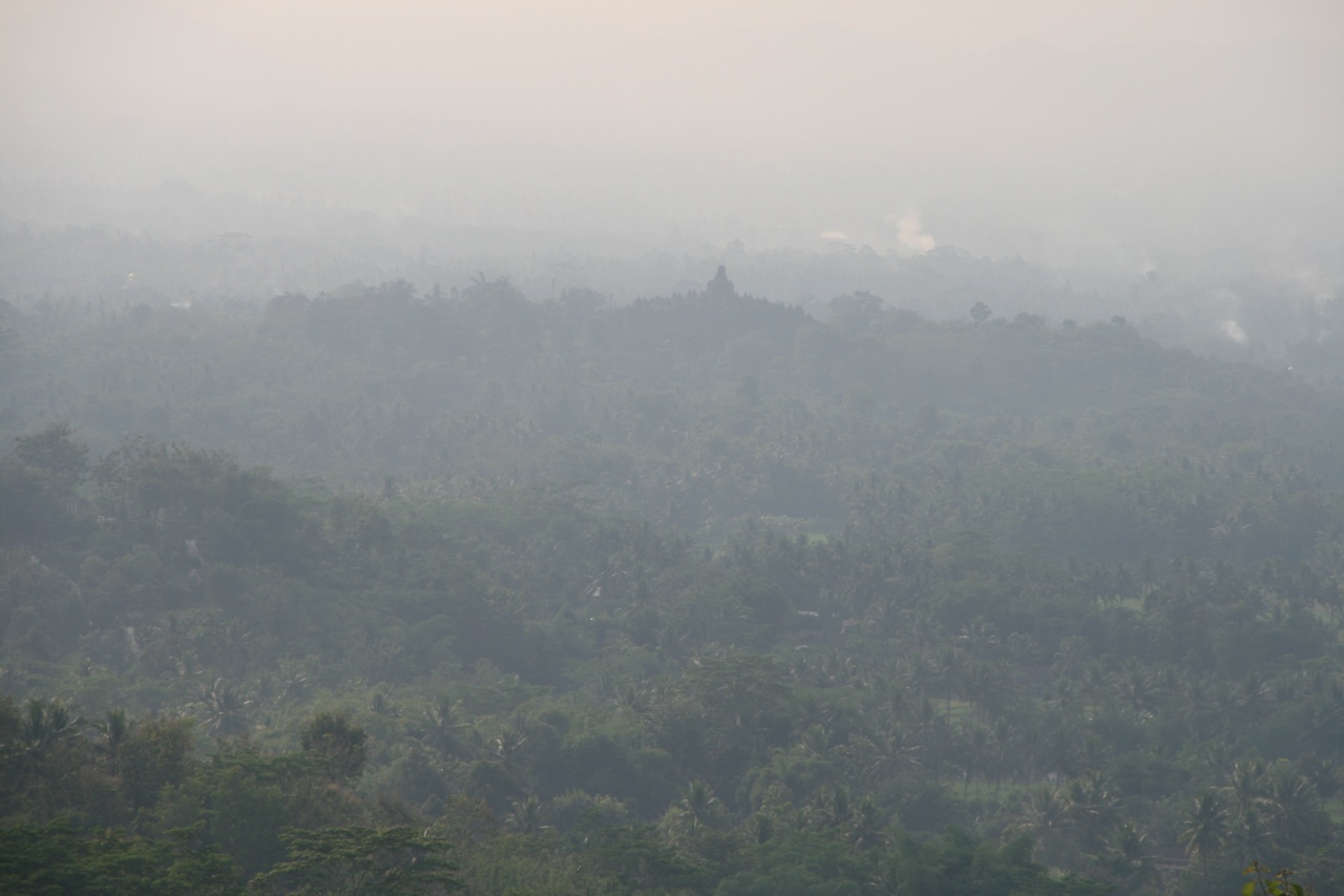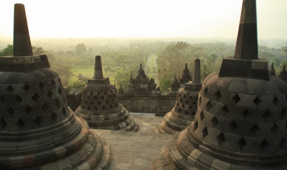 Borobudur to największa świątynia buddyjska w Indonezji. Wygląda jak wielopoziomowa piramida z rozmieszczonymi na szczycie kamiennymi ażurowymi dzwonami (stupami) z wielkim centralnym pośrodku. W każdej ze stup umieszczono wizerunek siedzącego Buddy. Poszczególne poziomy świątyni opowiada na rzeźbionych panelach historię postaci z wierzeń buddyjskich. Ze szczytu rozpościera się widok na okalającą całość dżunglę. Obstrykanie całości wraz z kontemplacją zajmuje nam ok 2h. Kierując się do wyjścia przechodzimy przez ścieżkę usłaną straganami, które o dziwo jeszcze nie są czynne. Ogólnie wydaje się, że tutejsi sprzedawcy robią łaskę pokazując jakiekolwiek zainteresowanie potencjalnym klientom przeciwnie do ich opowiedników z Kambodży, Tajlandii czy Malezji. Może to Ramadan ale fakt faktem, że do tej pory byliśmy przyzwyczajeni że sprzedawcy\nagabywacze wprost nas oblepiają w tego rodzaju miejscach a tutaj praktycznie nikt nas nie atakuje. Cały dzień chodzi nam po głowie niedoszly Sunrise więc postanawiamy zrobić kolejne podejście.  Wjeżdżamy na górę ok 9:00. W koło żywej duszy – w końcu to sunrise hill a tu pełne słońce.