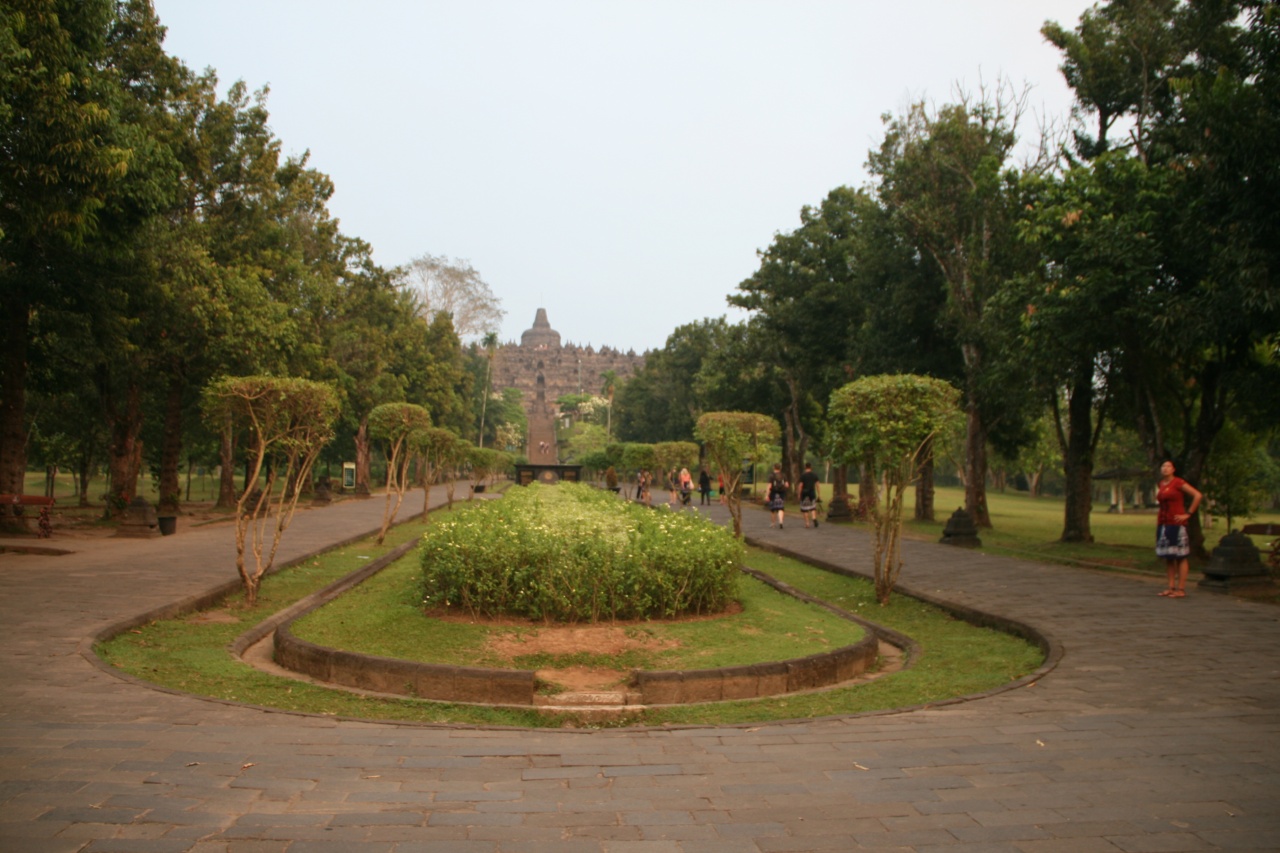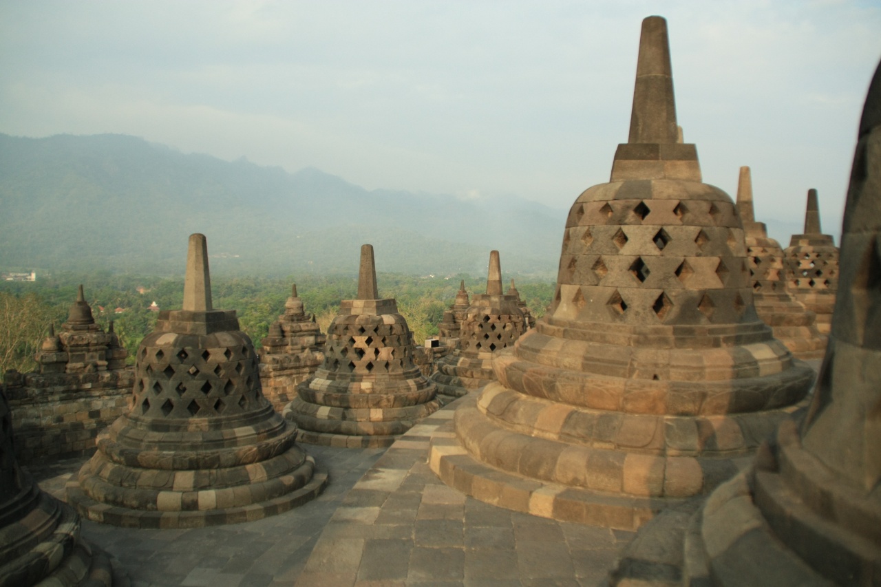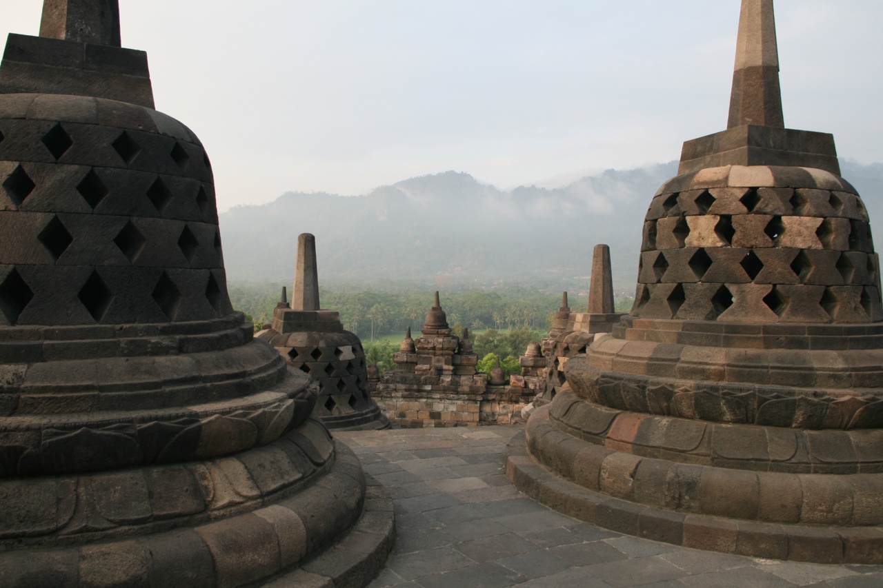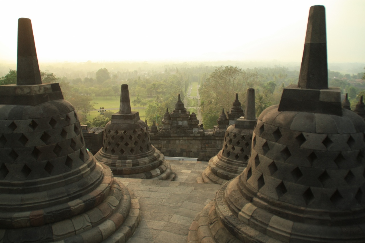 Borobudur to największa świątynia buddyjska w Indonezji. Wygląda jak wielopoziomowa piramida z rozmieszczonymi na szczycie kamiennymi ażurowymi dzwonami (stupami) z wielkim centralnym pośrodku. W każdej ze stup umieszczono wizerunek siedzącego Buddy. Poszczególne poziomy świątyni opowiada na rzeźbionych panelach historię postaci z wierzeń buddyjskich. Ze szczytu rozpościera się widok na okalającą całość dżunglę. Obstrykanie całości wraz z kontemplacją zajmuje nam ok 2h. Kierując się do wyjścia przechodzimy przez ścieżkę usłaną straganami, które o dziwo jeszcze nie są czynne. Ogólnie wydaje się, że tutejsi sprzedawcy robią łaskę pokazując jakiekolwiek zainteresowanie potencjalnym klientom przeciwnie do ich opowiedników z Kambodży, Tajlandii czy Malezji. Może to Ramadan ale fakt faktem, że do tej pory byliśmy przyzwyczajeni że sprzedawcy\nagabywacze wprost nas oblepiają w tego rodzaju miejscach a tutaj praktycznie nikt nas nie atakuje. Cały dzień chodzi nam po głowie niedoszly Sunrise więc postanawiamy zrobić kolejne podejście.  Wjeżdżamy na górę ok 9:00. W koło żywej duszy – w końcu to sunrise hill a tu pełne słońce.